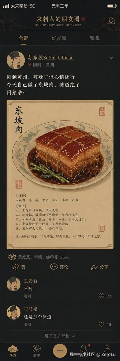 “宋朝人的朋友圈”/“SONG DYNASTY SOCIAL MEDIA FEED”,一种古今穿越、幽默融合的界面设计风格。整张图模拟的是手机社交媒体界面,但内容全部都是宋代场景。头像是一位宋代文人的肖像,用户名是 “Su Dongpo SuShi_Official”,发帖内容是:“刚到黄州,被贬了但感觉还好。今天自己做了东坡肉,味道绝了,附上做法:”,配图是一张工笔画风格的东坡肉特写。点赞列表为:“Huang Tingjian, Qin Guan, Fo Yin etc. 126 people”,评论区为:“Wang Anshi: Hehe” “Sima Guang: Still the same taste”。界面中的点赞图标等元素改成宋代纹样,状态栏显示 “Great Song Mobile 5G” 和 “Third Year of Yuanfeng”,整体色调是手机深色模式搭配典雅的宋代色系,是一幅历史与社交媒体趣味碰撞的代表作。