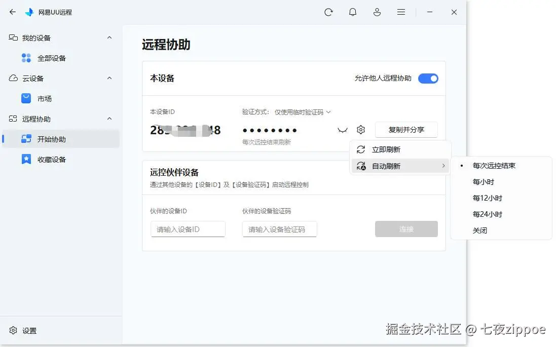 UU远程的免登录功能彻底颠覆了这一模式:被协助方无需注册账号,也无需输入手机号、邮箱等个人信息,只需打开客户端,进入【远程协助】板块,即可直接显示本设备ID和动态验证码。