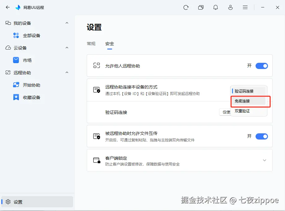 在客户端的“设置”中选择“安全”tab,在远程协助连接本地设备的方式中选择“免密连接”,如下图