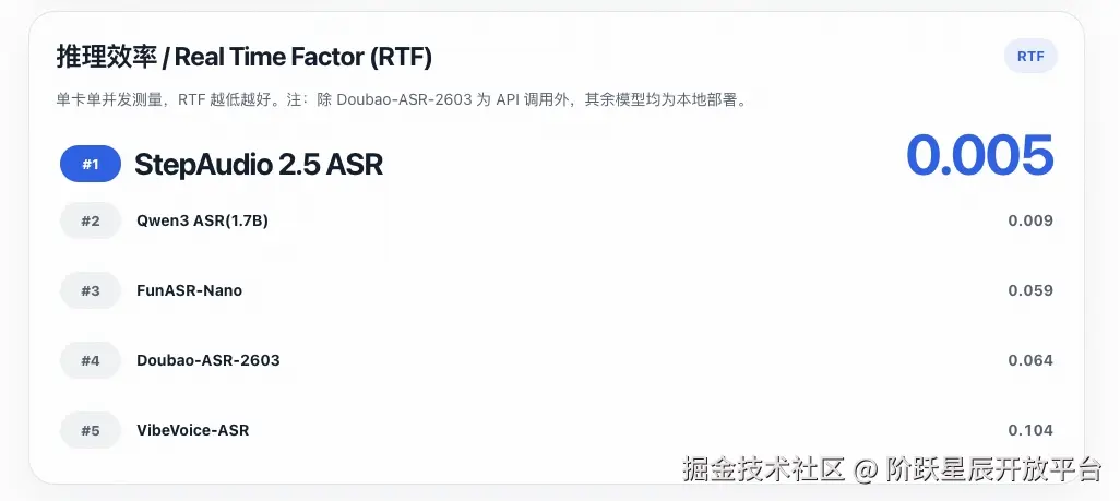 StepAudio 2.5 ASR 推理速度是第二名 Qwen3 ASR 的近 2 倍,是 VibeVoice、Doubao 等主流方案的 10~20 倍。