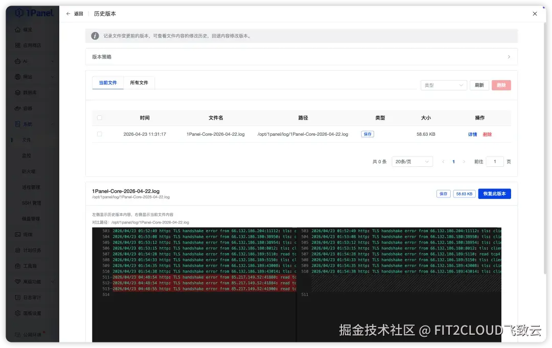 在文件管理方面,1Panel v2.1.9版本新增了文件历史管理功能。用户可以查看文件的历史记录,了解文件在不同时间点的变更情况,并且支持将历史文件与当前文件内容进行对比,帮助用户快速定位配置变更或内容差异。对于不再需要保留的历史文件,也可以直接进行删除,方便用户追踪文件变更和管理文件的历史版本。