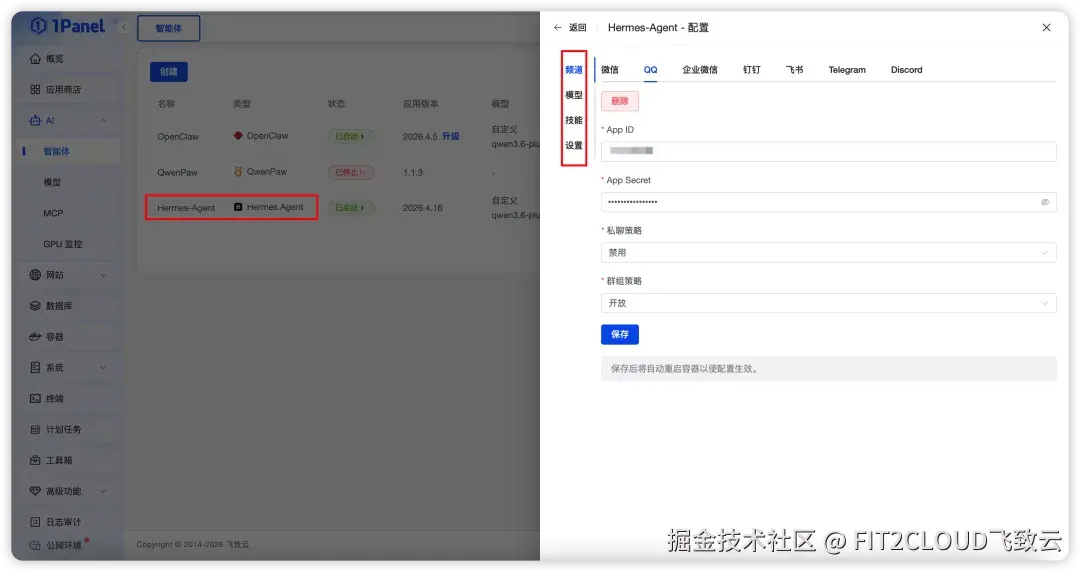 在v2.1.9版本中,1Panel新增Hermes Agent支持。Hermes Agent是一个开源、自托管的AI智能体,支持长期记忆、Skills技能与多平台消息接入。用户可以在1Panel中创建Hermes Agent,统一配置模型、技能和聊天频道,并且将智能体接入微信、飞书等常用沟通渠道,让AI能力更方便地融入日常沟通、团队协作与运维辅助等场景。