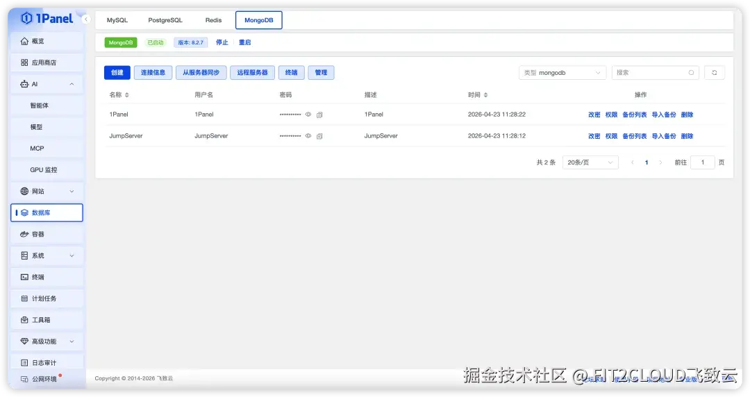 在数据库管理方面,1Panel v2.1.9版本新增MongoDB数据库管理功能,支持创建数据库和用户、修改密码与调整权限,覆盖了常见的MongoDB基础管理操作。对于已有的远程MongoDB实例,用户也可以添加至1Panel中进行统一管理,并且同步远程数据库信息。另外,用户还可以在面板中对MongoDB数据库进行备份与恢复,让日常数据库运维操作更加集中。