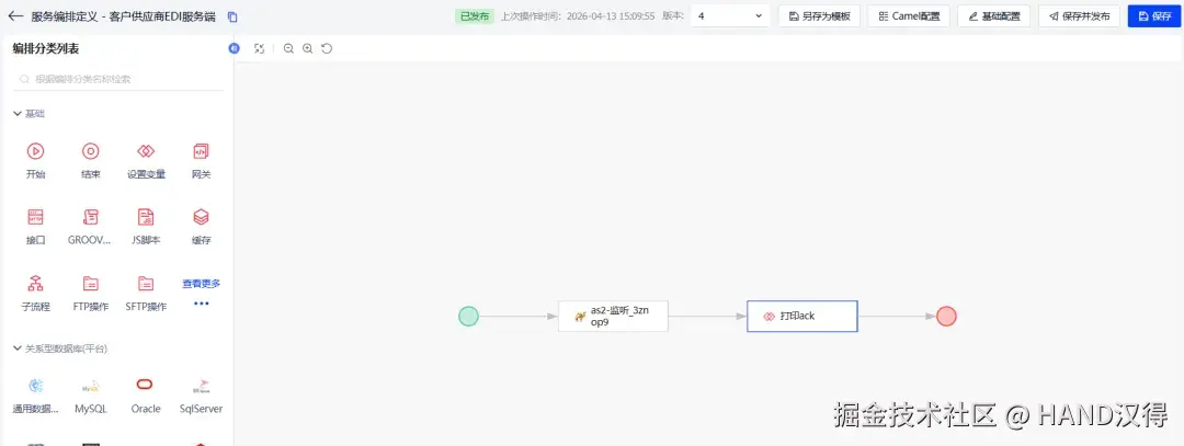 基于此能力,我们针对EDI需求,快速扩展出三个定制节点:AS2接收节点、Smooks处理节点(含校验+997 ACK)、AS2发送节点,轻松应对端到端场景。