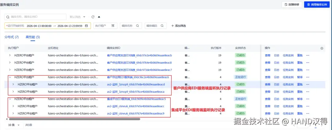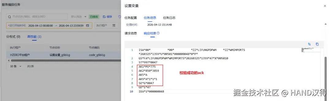 客户供应商每次发送完EDI消息,集成平台EDI服务端编排会接收该消息进行处理并生成执行记录,客户供应商EDI服务端编排会接收ack并生成执行记录