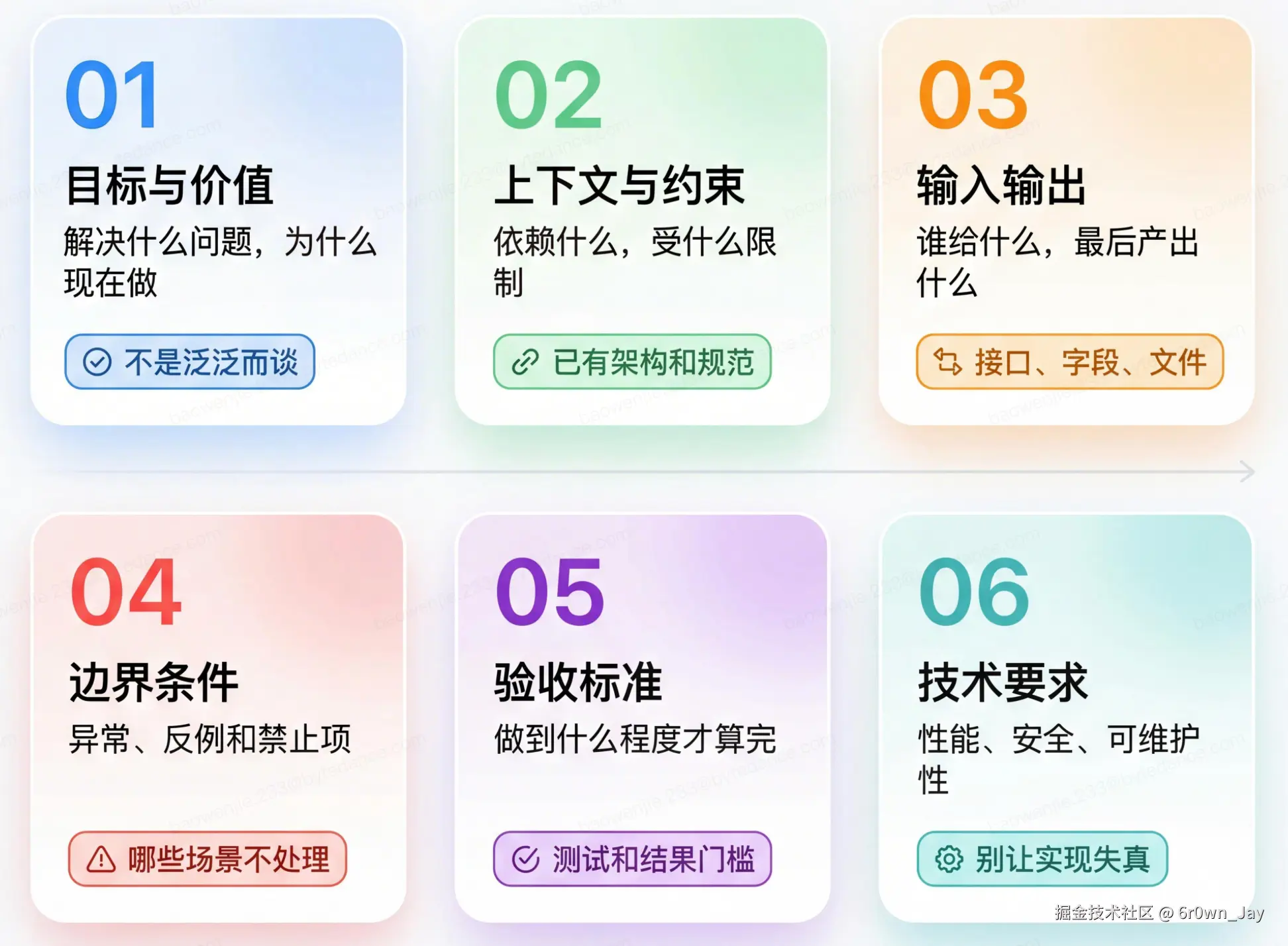 AI 理解项目的"世界观"。需要填写技术栈及版本、架构约束、编码规范、业务领域术语。把项目级约束固化为文件,AI 每次工作时读取,减少幻觉和风格漂移。