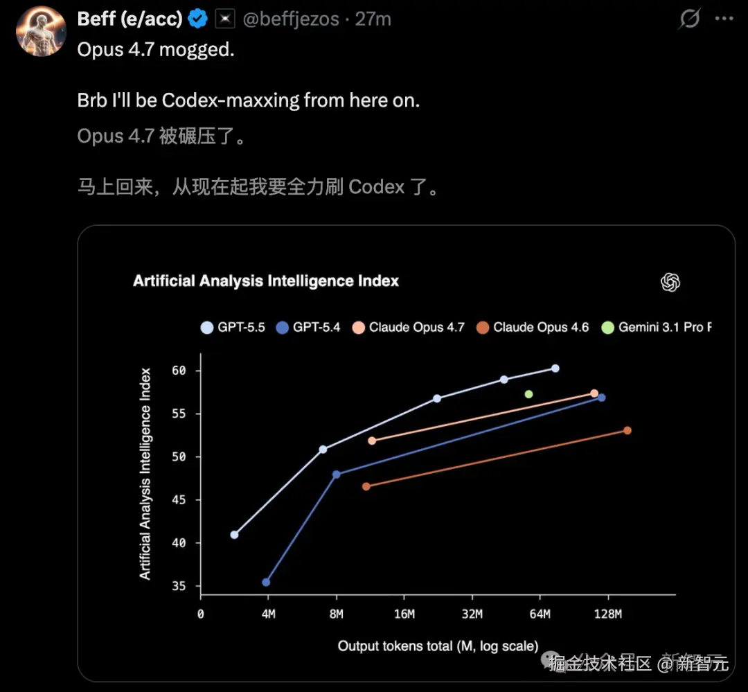 总言之,GPT-5.5 的诞生,堪称迎来了脱胎换骨的蜕变。对战 Opus 4.7,一张图就够了。