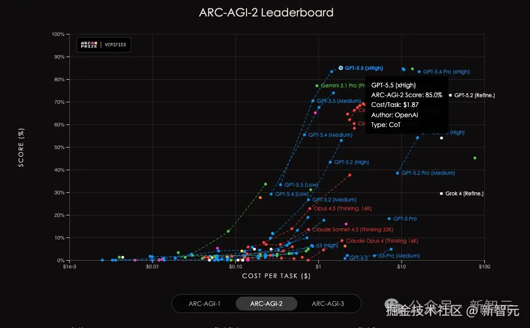 在 AAI 测试中,相同输出 token 下,GPT-5.5 智能指数冠绝全球;另在 ARC-AGI-2 上,同样刷新了 SOTA。