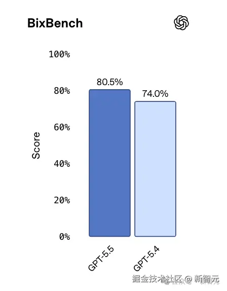 BixBench,基于真实生物信息学设计的评测,GPT-5.5 在所有已公开分数的模型中排名第一,80.5%。