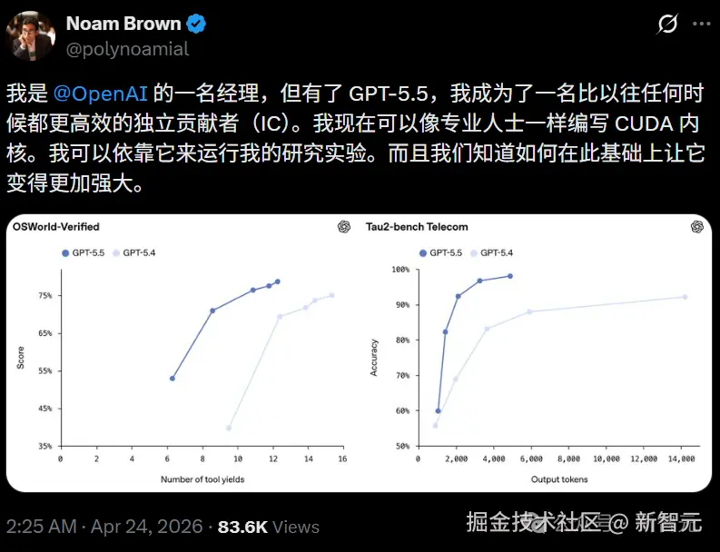 OpenAI 研究员 Noam Brown 直言,有了 GPT-5.5,自己也能像专业人士一样编写 CUDA 内核,运行研究实验。