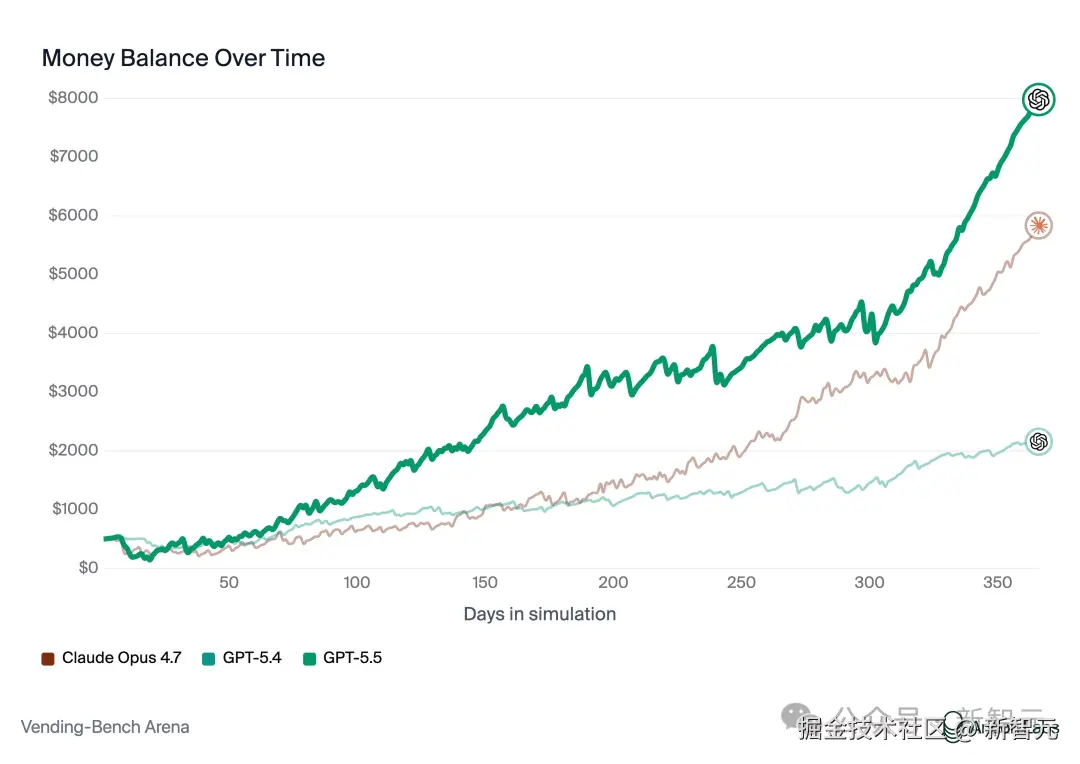 另在 Vending-Bench 中,GPT-5.5 同样暴击 Opus 4.7。