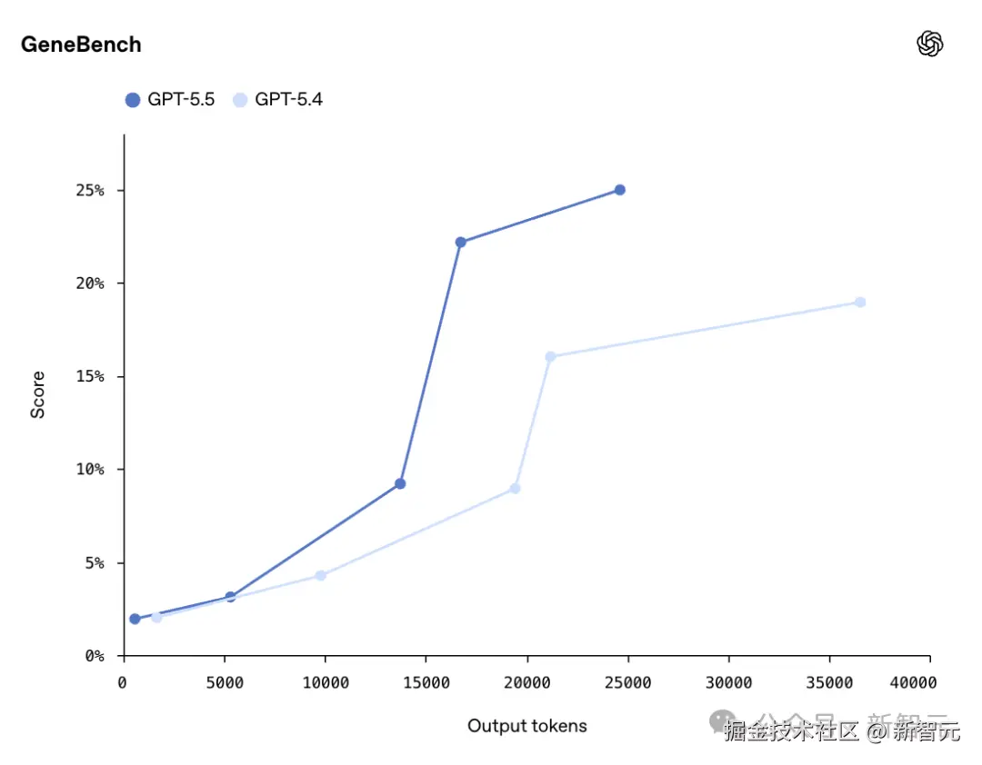 GeneBench 上,GPT-5.5 得分 25.0%,GPT-5.4 是 19.0%。这个评测专门测多阶段科学数据分析,要求模型在几乎没有人工干预的情况下处理模糊数据、应对隐藏混杂因素。