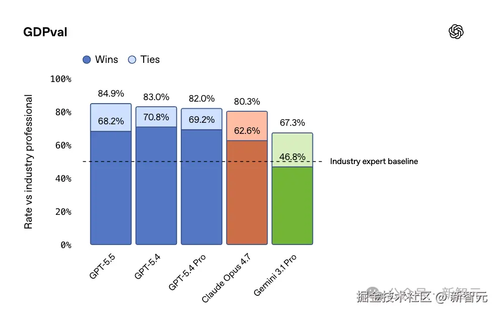 编程之外,GPT-5.5 在「知识型工作」上的数据同样亮眼。