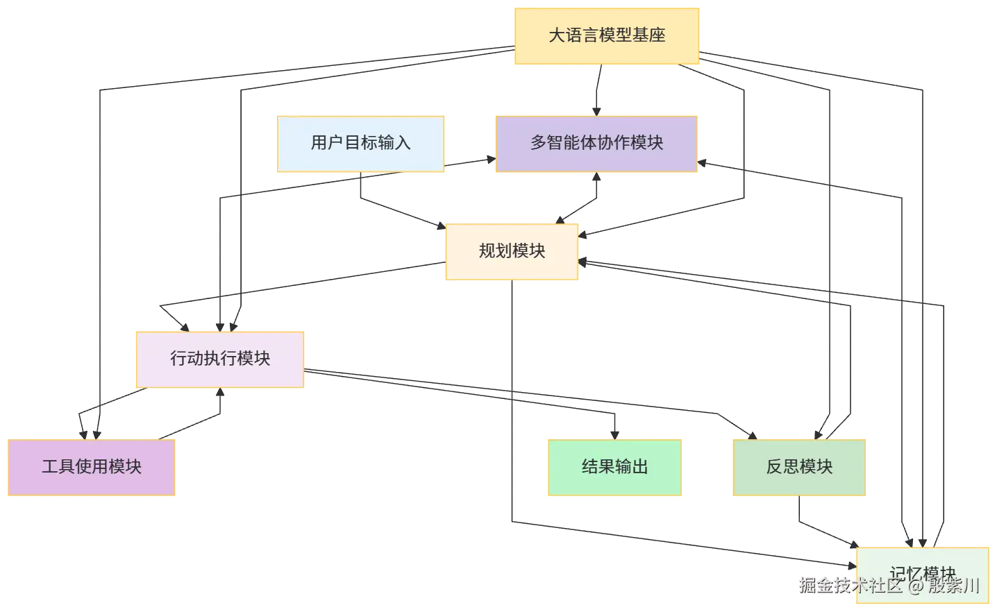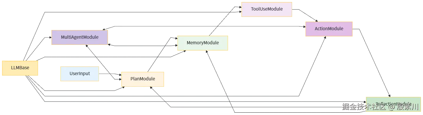 - 执行过程中需要调用外部能力时,行动执行模块通过工具使用模块,选择合适的工具,校验参数,执行工具调用,获取执行结果,继续推进任务。