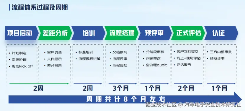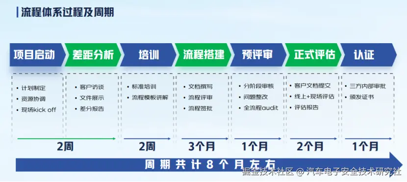 流程体系建立周期: 对于从零开始建立功能安全开发流程体系的企业,完整建立一套覆盖ASIL D等级的流程体系,在条件具备的情况下,部分企业可在8个月左右完成流程体系搭建和认证。