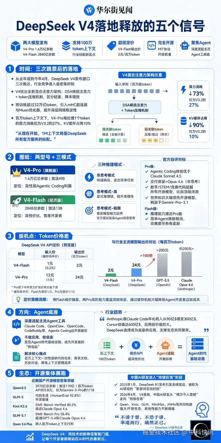 第三,定价策略极具攻击性。 V4-Flash输入1元/百万token,输出2元;V4-Pro输入12元/百万token,输出24元。相比OpenAI GPT-5.5的30美元/百万token,价格相差超100倍。这种"白菜价铺量、高价撑场景"的打法,被解读为鼓励开发者向Agent开发转型。