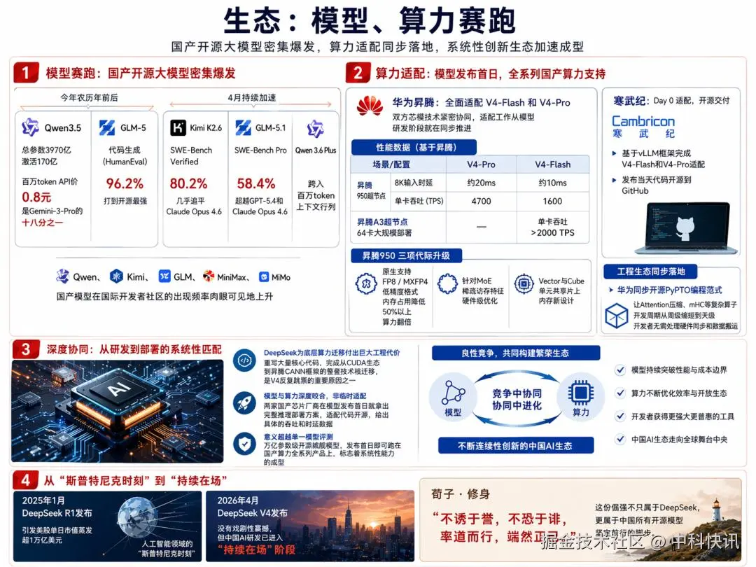 第四,生态协同已成定局。 华为昇腾(A2/A3/950)、寒武纪等国产算力厂商已完成Day 0适配与代码开源,系统性地完成了从CUDA到CANN的迁移,证明中国AI研发的系统性创新能力。
