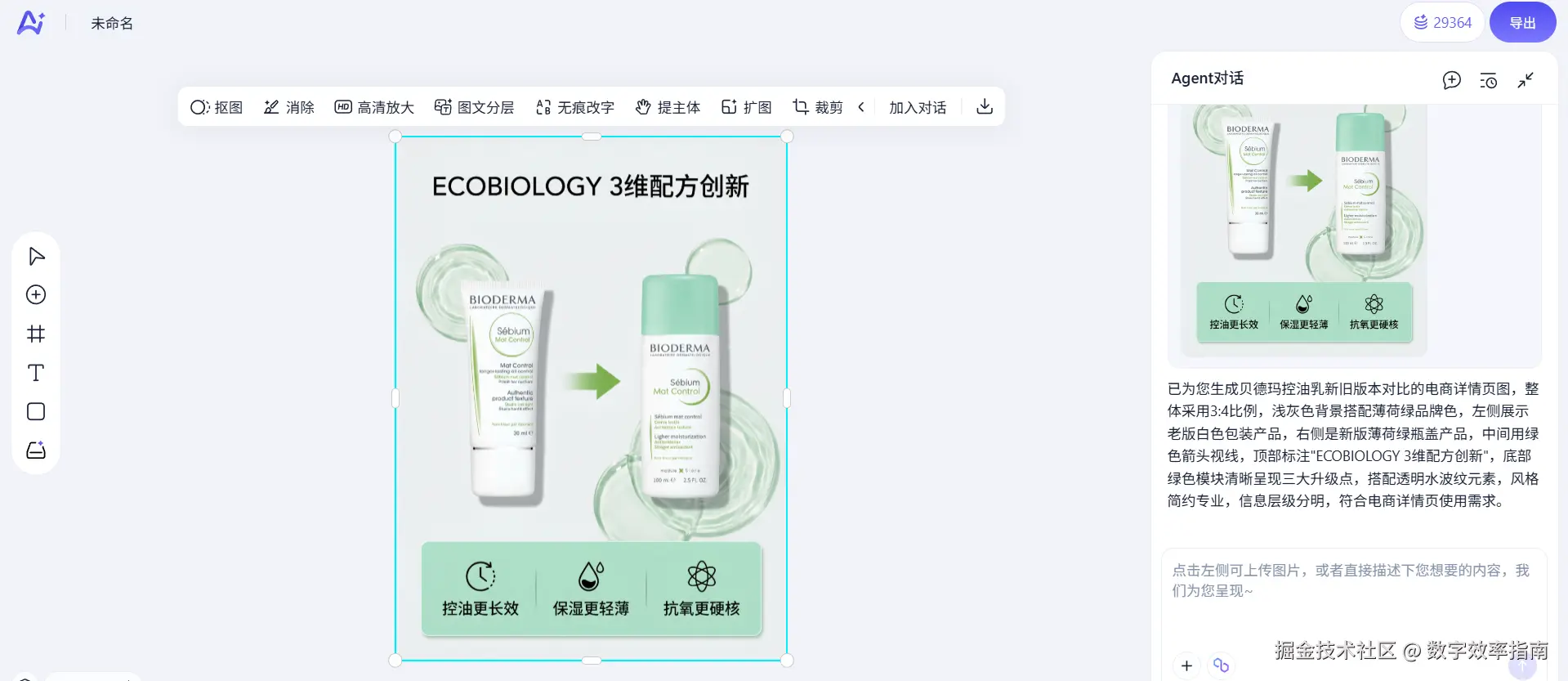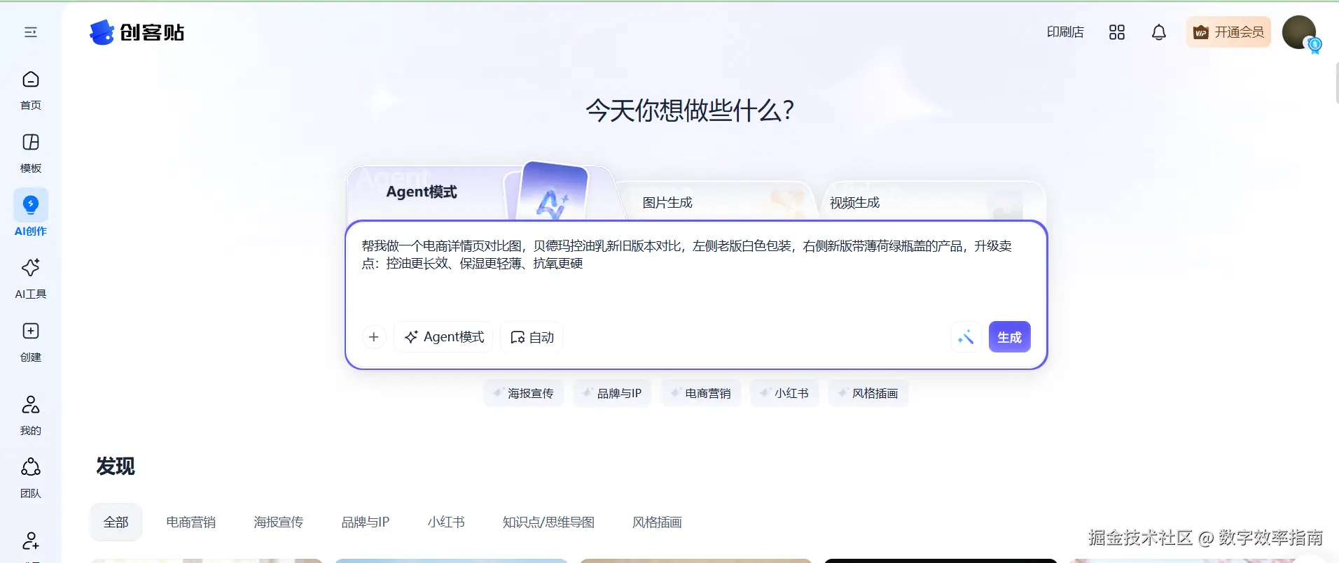 登录创客贴后进入“AI创作”——创客贴Agent页面,上传你的产品图,并输入描述——比如“帮我做一个控油乳产品新旧版本详情页对比图,左侧老版白色包装,右侧新版带薄荷绿瓶盖的产品,升级卖点:控油更长效、保湿更轻薄、抗氧更硬”。不用背提示词,怎么跟人聊天就怎么说。AI会基于你的描述生成完整的详情页框架,包含产品图、卖点文案、排版设计即可。