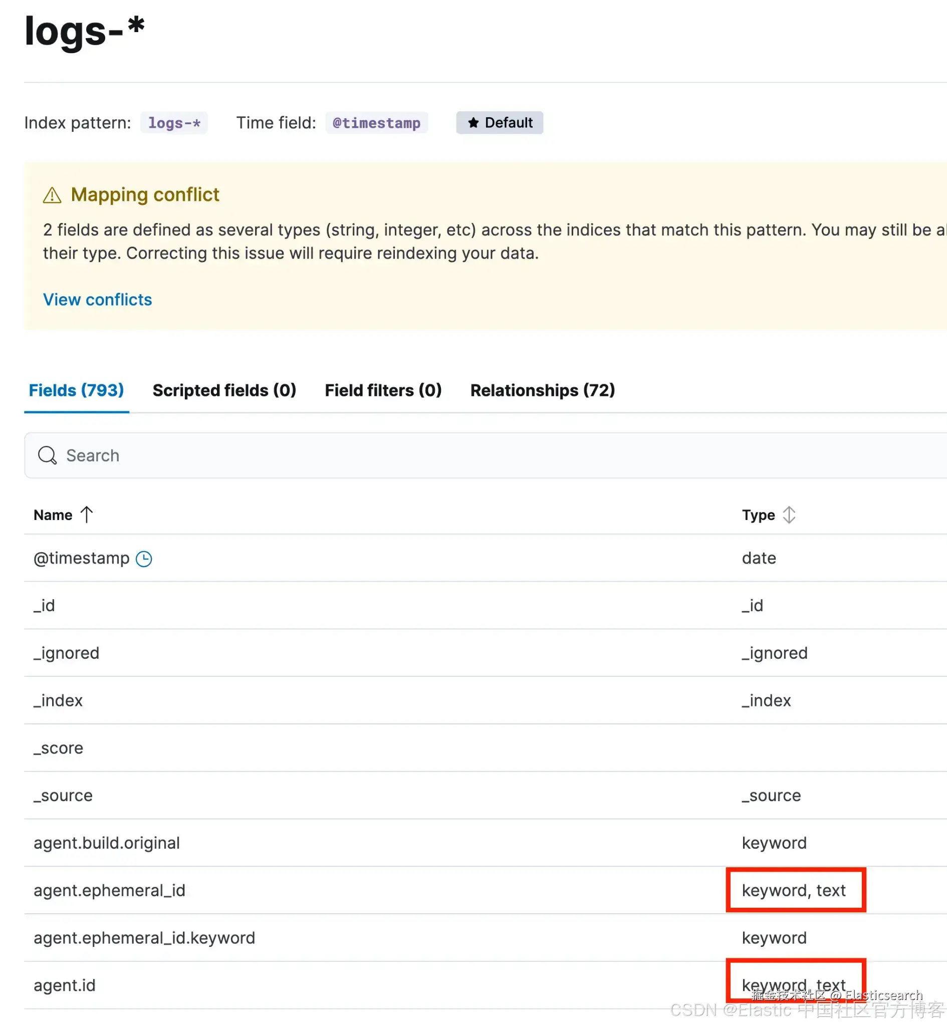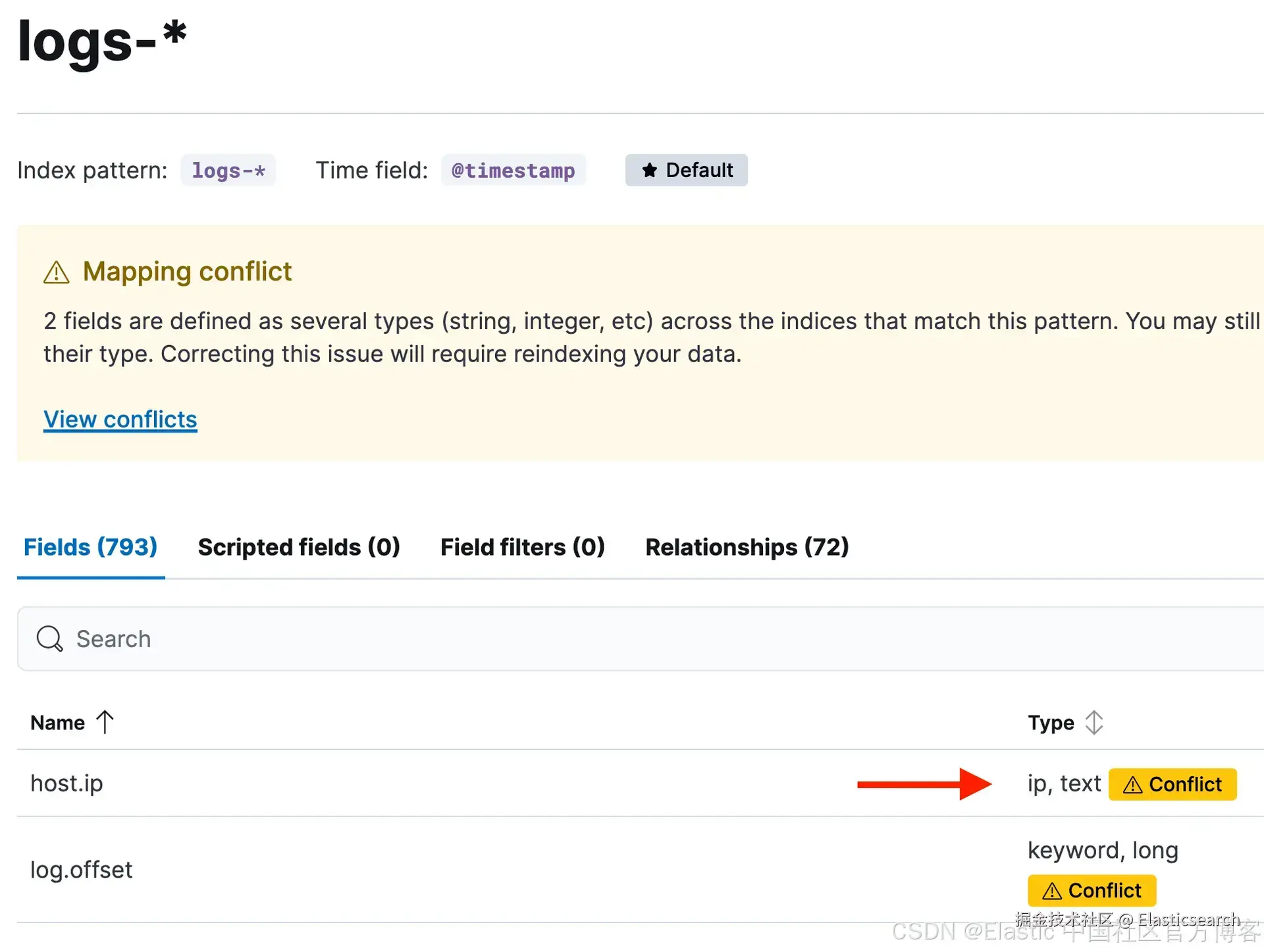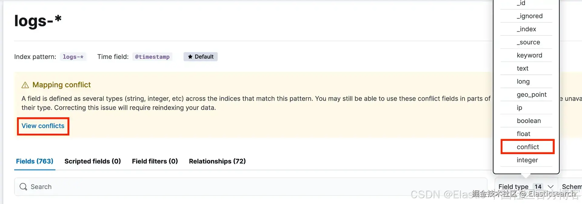 要确定哪些字段存在映射冲突,请导航到 Stack Management -> Data Views -> logs-(使用 logs- 数据视图可以查看所有以 logs- 前缀开头的最高层级数据)。如果存在冲突,会显示一个黄色提示框。你可以点击 “View conflicts”,或者在搜索框旁边的 Field type 下拉框中选择 “conflict”。