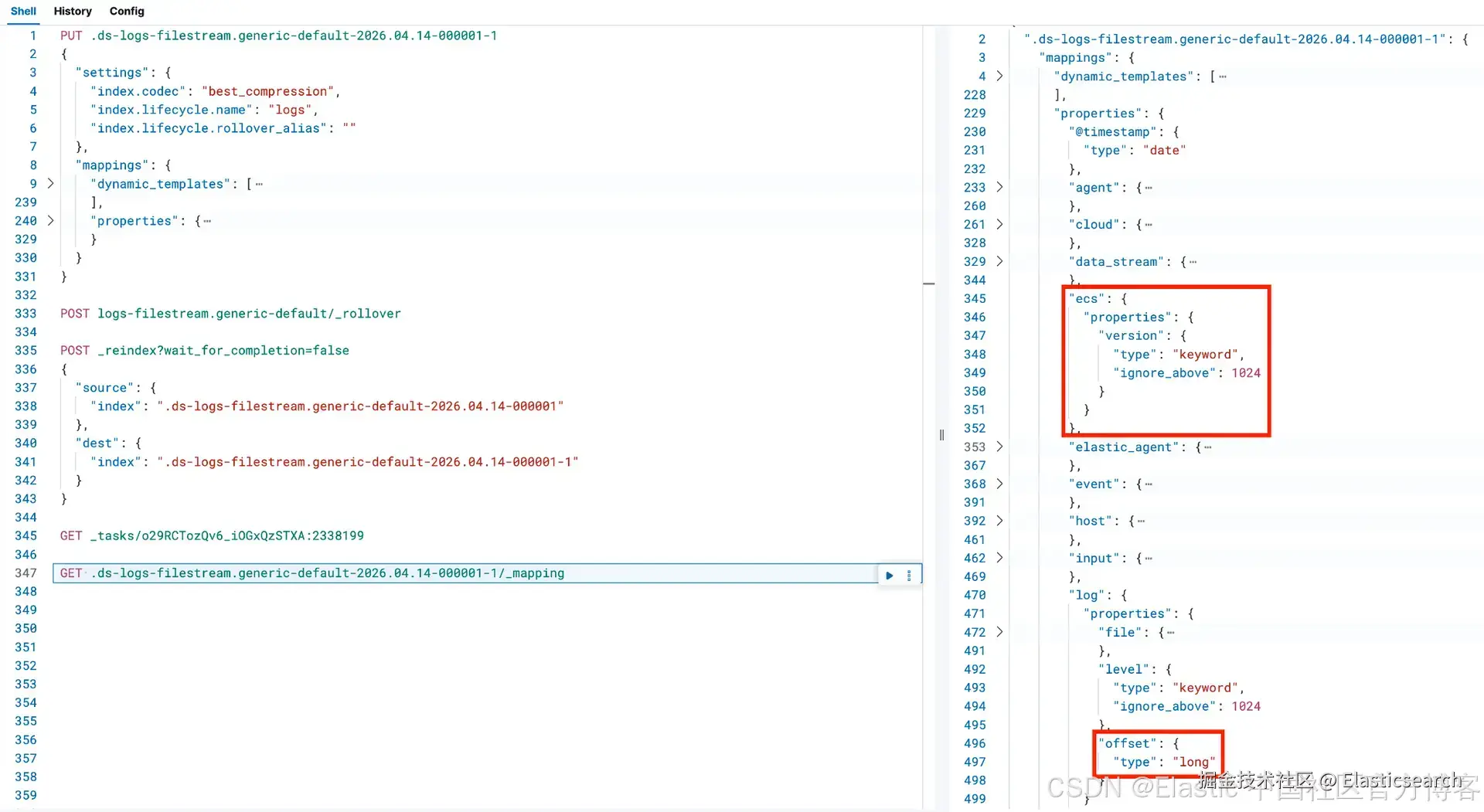 重要提示:如果没有复制模板 JSON 就继续进行 reindex 操作,虽然 log.offset 冲突会被解决,但由于未保持当前映射的完整性,可能会与集成产生新的冲突,从而导致需要重复处理原本的问题,增加额外工作量。