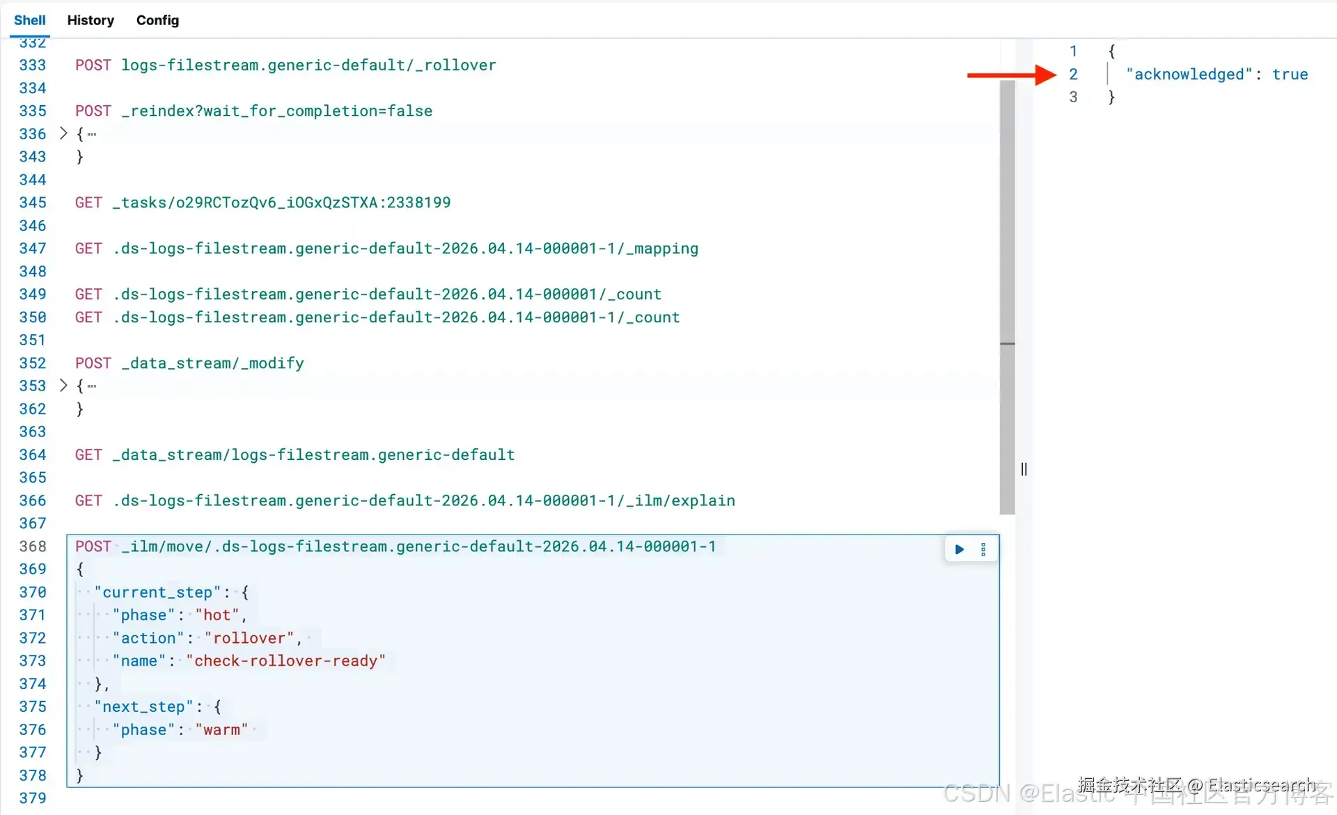 _ilm/explain命令,以确认该 backing index 已经进入下一个阶段,并且不再处于 hot 状态。