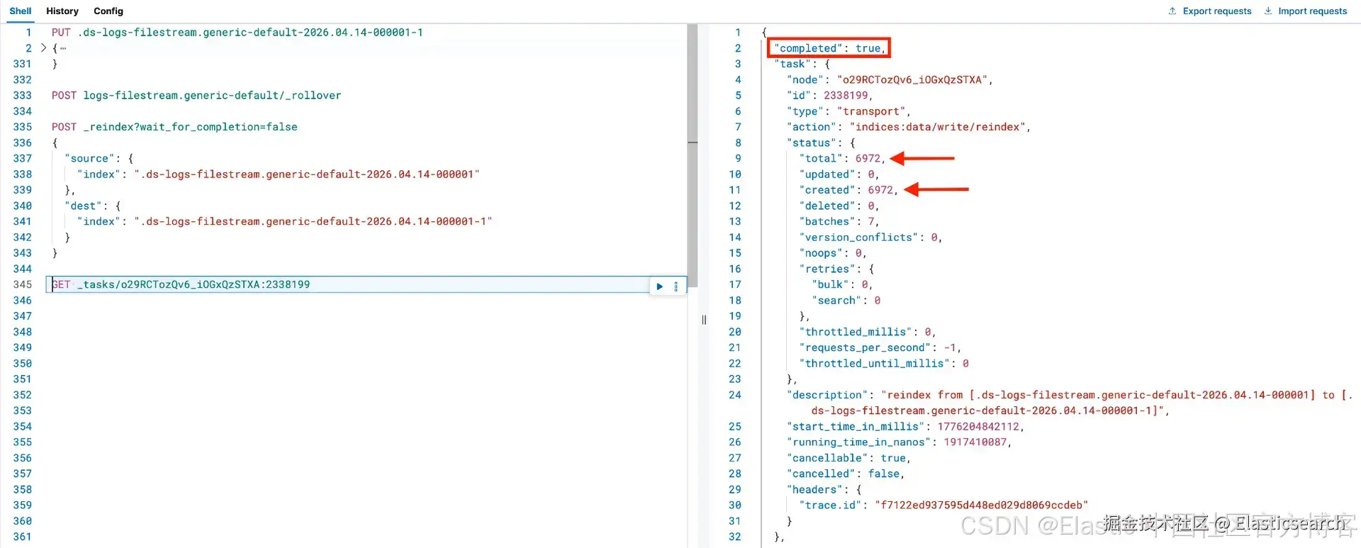 reindex 的持续时间取决于原始 index 中的数据量。可以通过执行 GET 命令来跟踪完成情况,当看到 “completed”: true 时,表示任务已完成,其输出应类似如下所示。