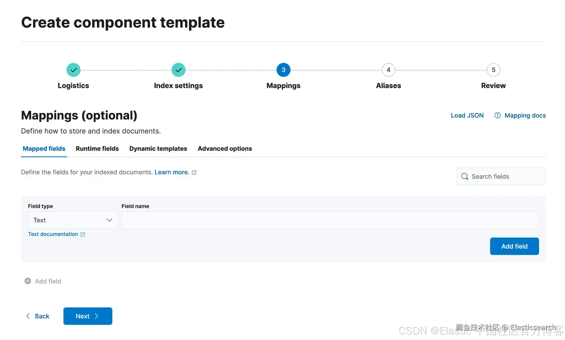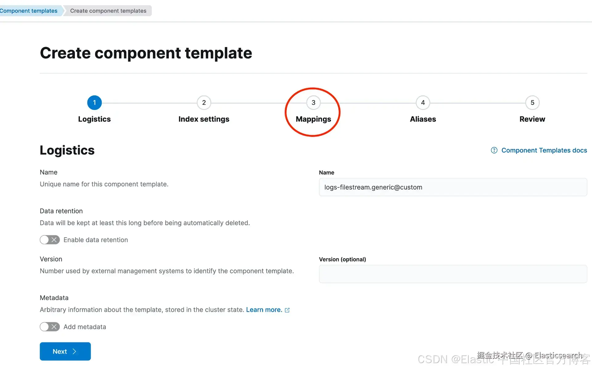 - 如果数据流存在映射冲突,你需要在该数据流的 @custom 组件模板中添加所有缺失的字段(包括 ECS 和非 ECS)的嵌套或映射。如果该模板尚未创建,请先创建,并确保为相关字段指定正确的映射类型。