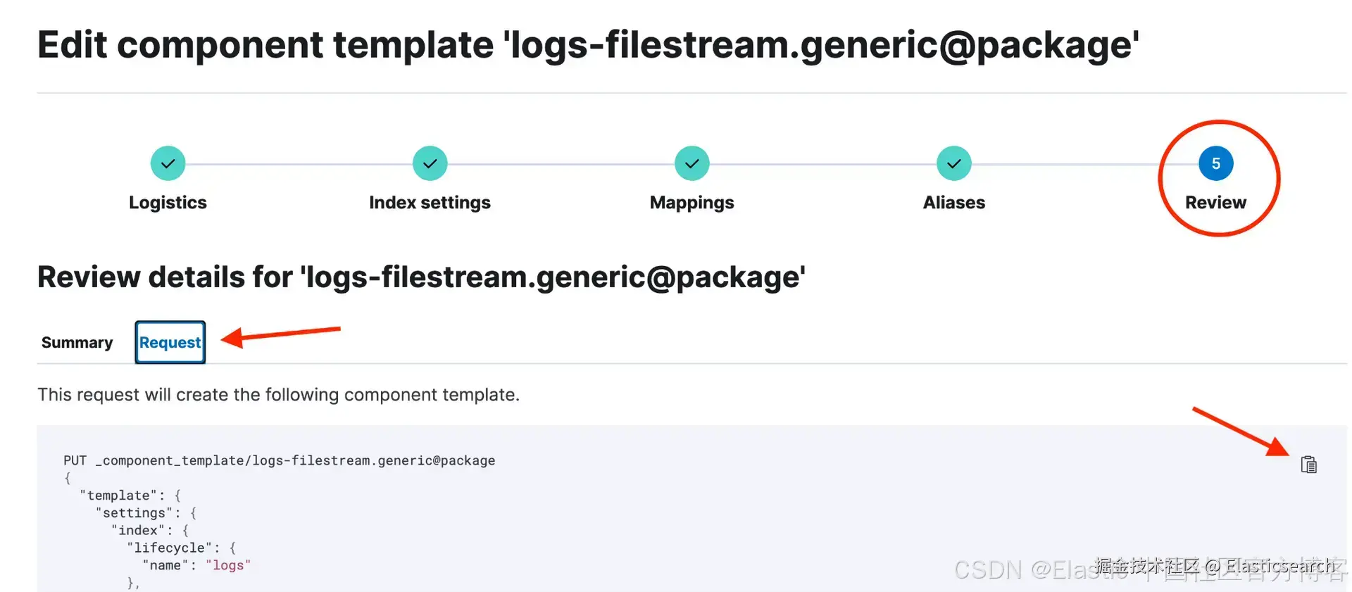 请打开数据流的 @package mappings 对应浏览器标签页。(路径:Stack Management -> Index Management -> Component Template -> logs-filestream.generic@package -> Manage -> Edit。)进入后,点击 Review 部分,然后选择 Request,最后点击右侧的 Copy 按钮。复制得到的组件模板 JSON 内容将确保在更新 log.offset 字段映射的同时,其余字段映射和设置得以保留。该 JSON 将作为新 reindex 后 backing index 的基础结构。