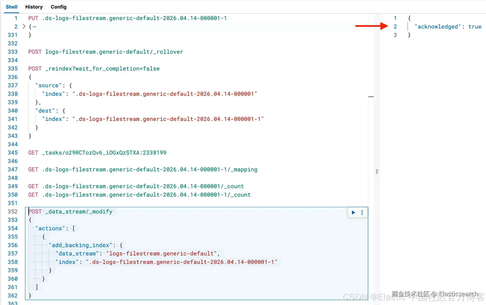 一旦确认文档数量一致且正确的映射已存在,就需要更新数据流以包含新的 backing index,避免在 index management 中出现孤立的 backing index,否则 ILM 策略将不会在该 backing index 上执行。
