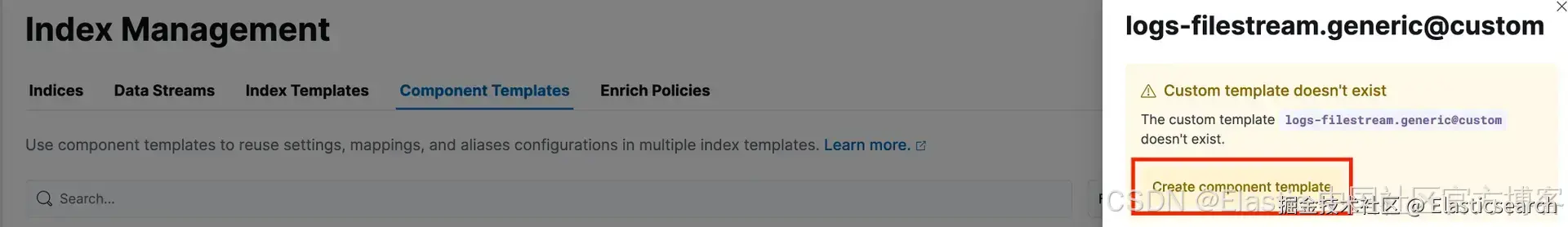 - 要创建 @custom 组件模板(或验证其已被使用且已配置),请导航到 Index Templates,输入目标数据流的名称,然后点击该数据流正在使用的 @custom 模板。如果模板尚未创建,会出现一个黄色提示框,允许你通过 UI 创建该模板。