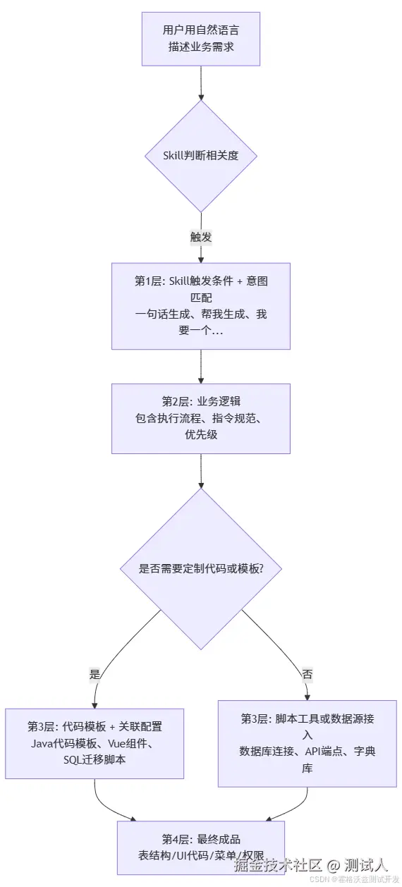 第三层是资源层。对于需要代码落地的场景,Skill-Creator会自动生成配套的代码模板、脚本和配置。在JeecgBoot这样深度融合的低代码平台中,生成的不只是代码片段,而是完整的前后端代码、数据库迁移脚本和菜单权限配置。