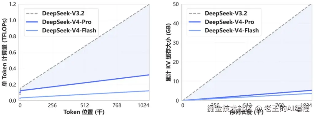 - V4-Pro:单 token 推理 FLOPs 只有 V3.2 的 27%,KV Cache(长上下文关键内存)用量仅为 10%。