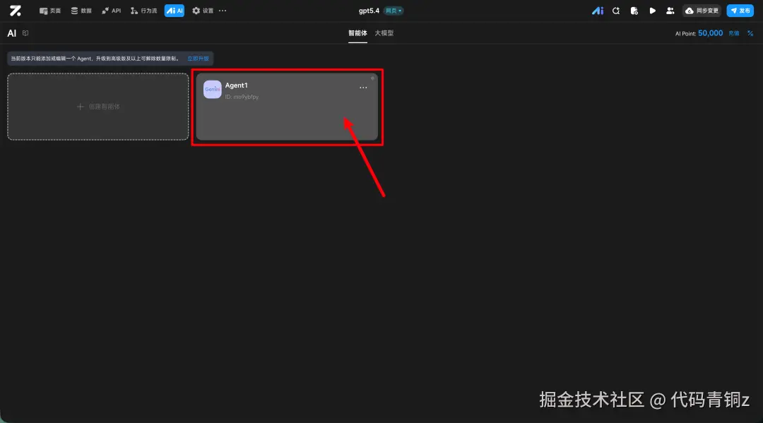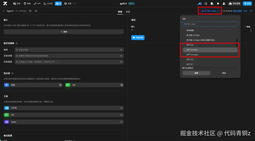进入智能体编辑页面,可在右上角直接切换至GPT 5.4 mini 或 GPT 5.4 nano模型。Zion 已预置集成,无需额外配置,即可直接消耗 AI Points 使用。