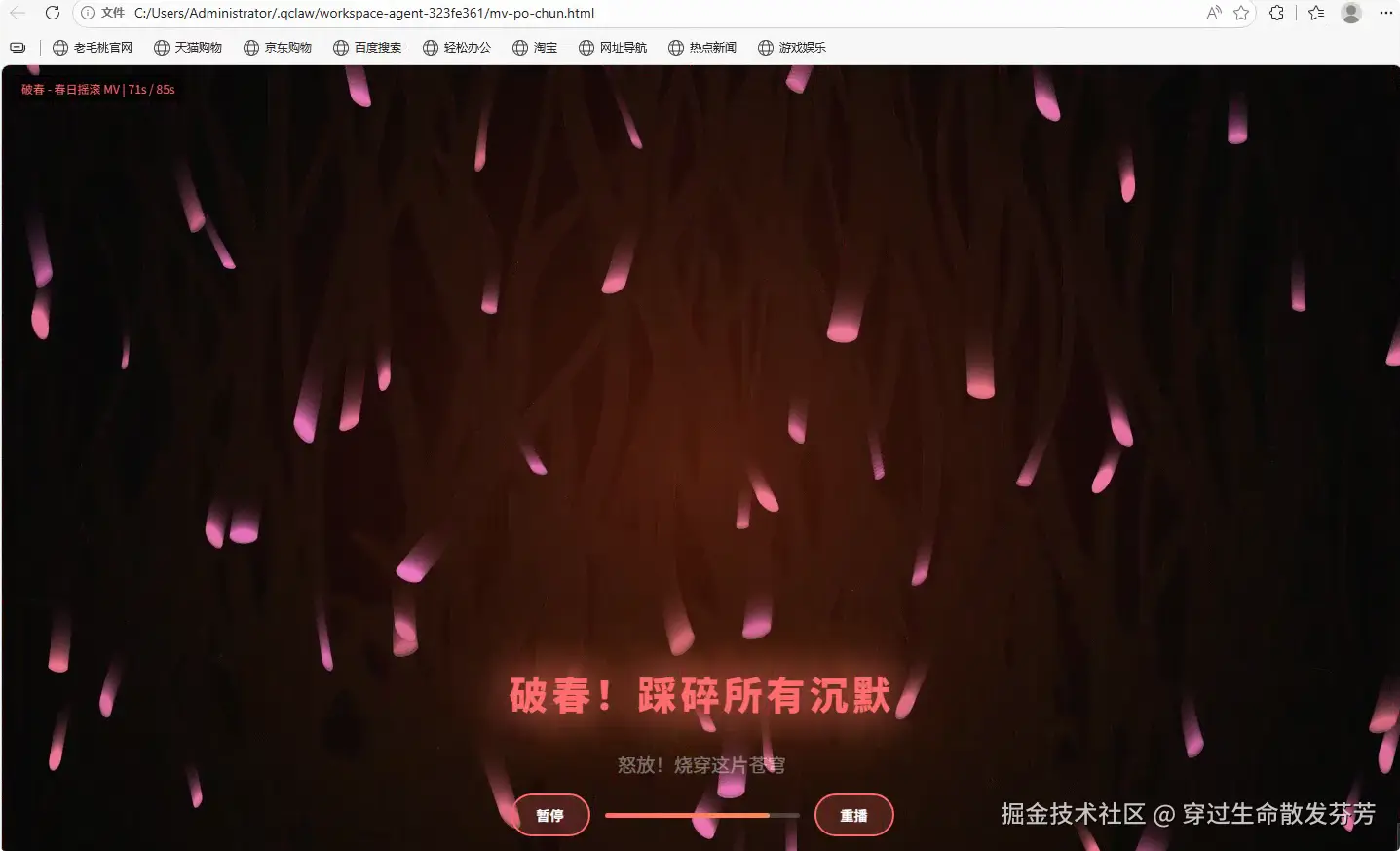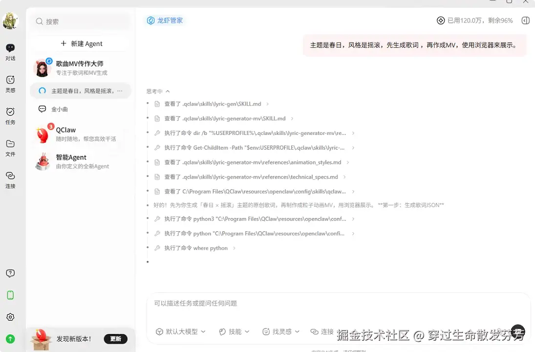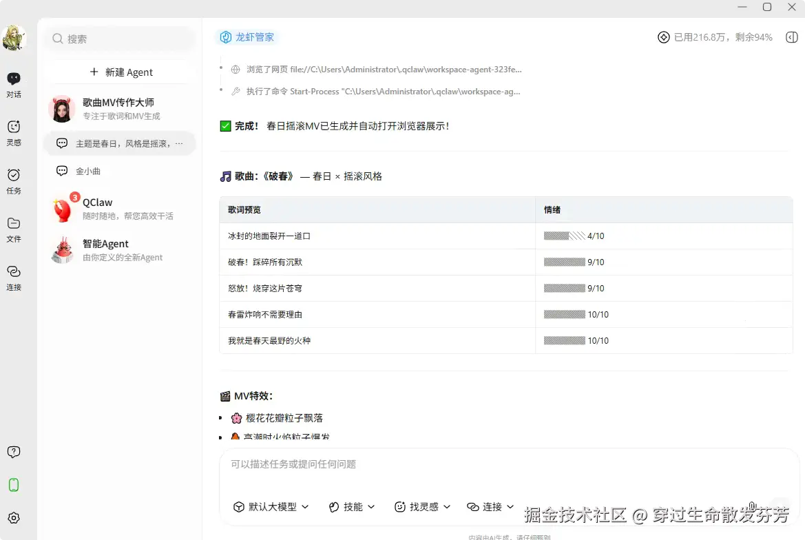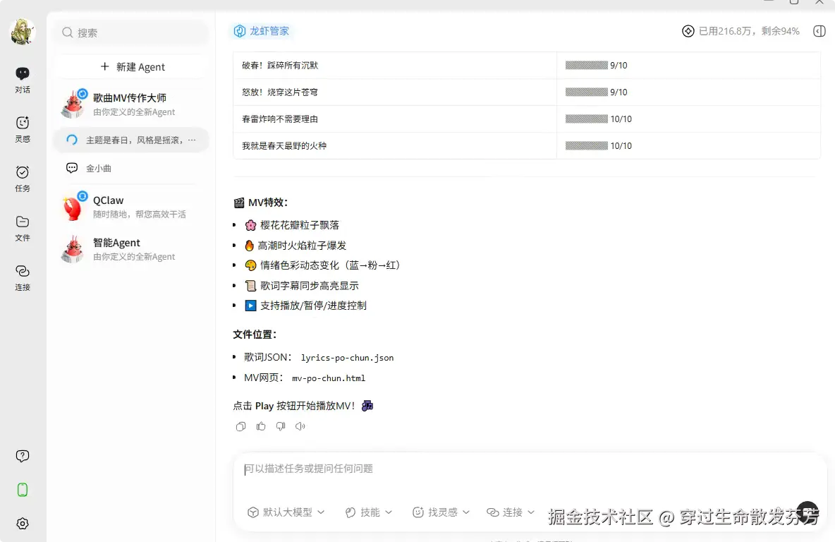 本方案通过Qclaw构建一个自定义Agent,实现了从抽象主题到可交互网页MV的完整转化。核心在于双Skill协同架构解耦创作逻辑,歌词生成专注文学性,MV生成聚焦技术实现。