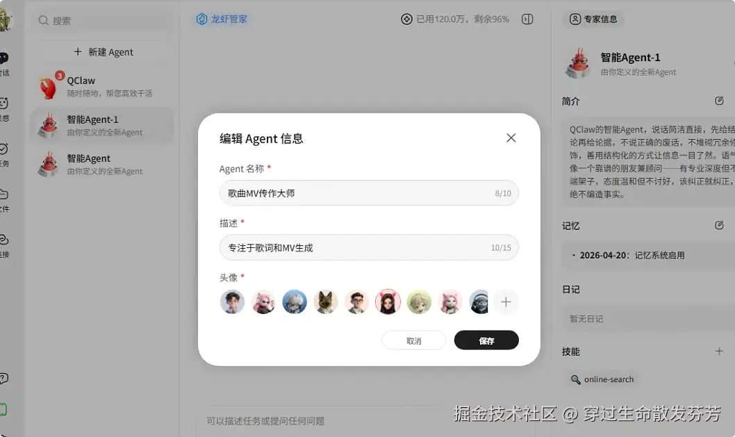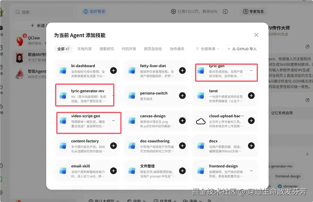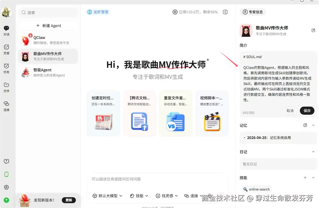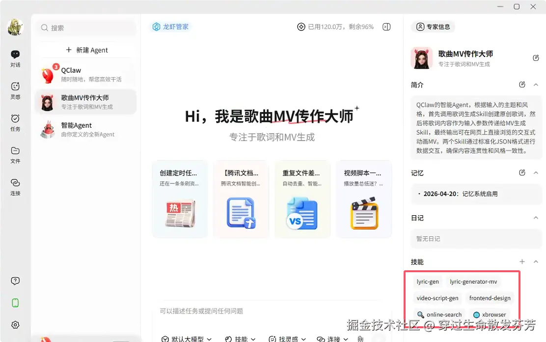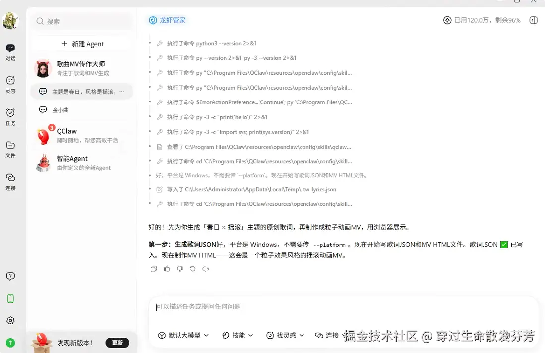本方案通过Qclaw构建一个自定义Agent,实现了从抽象主题到可交互网页MV的完整转化。核心在于双Skill协同架构解耦创作逻辑,歌词生成专注文学性,MV生成聚焦技术实现。