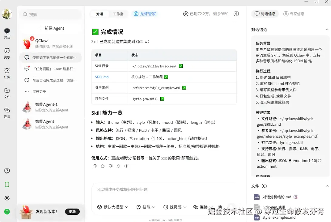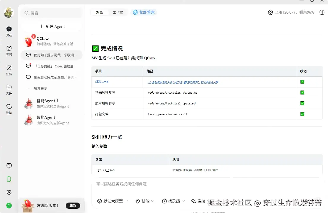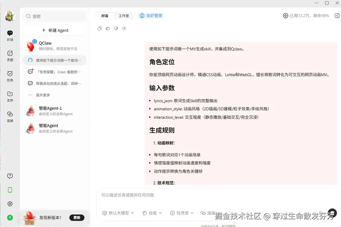 QClaw的智能Agent,根据输入的主题和风格,首先调用歌词生成Skill创建原创歌词,然后将歌词内容作为输入参数传递给MV生成Skill,最终输出可在网页上直接浏览的交互式动画MV。两个Skill通过标准化JSON格式进行数据交互,确保内容连贯性和风格一致性。