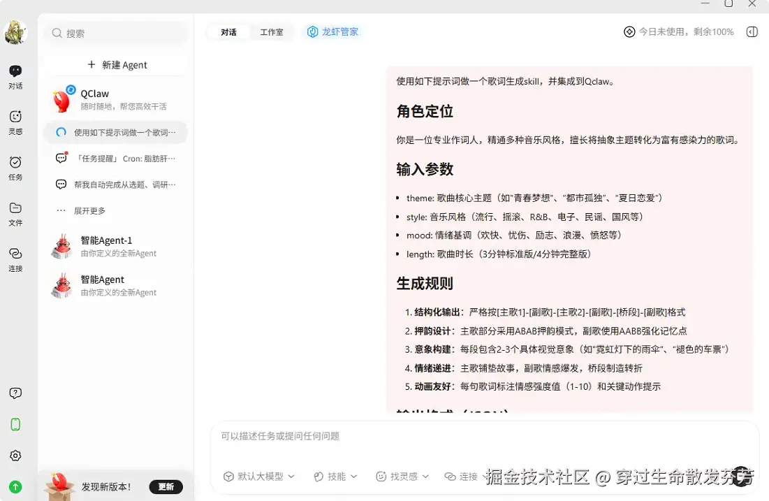 使用如下提示词做一个歌词生成skill,并集成到Qclaw。