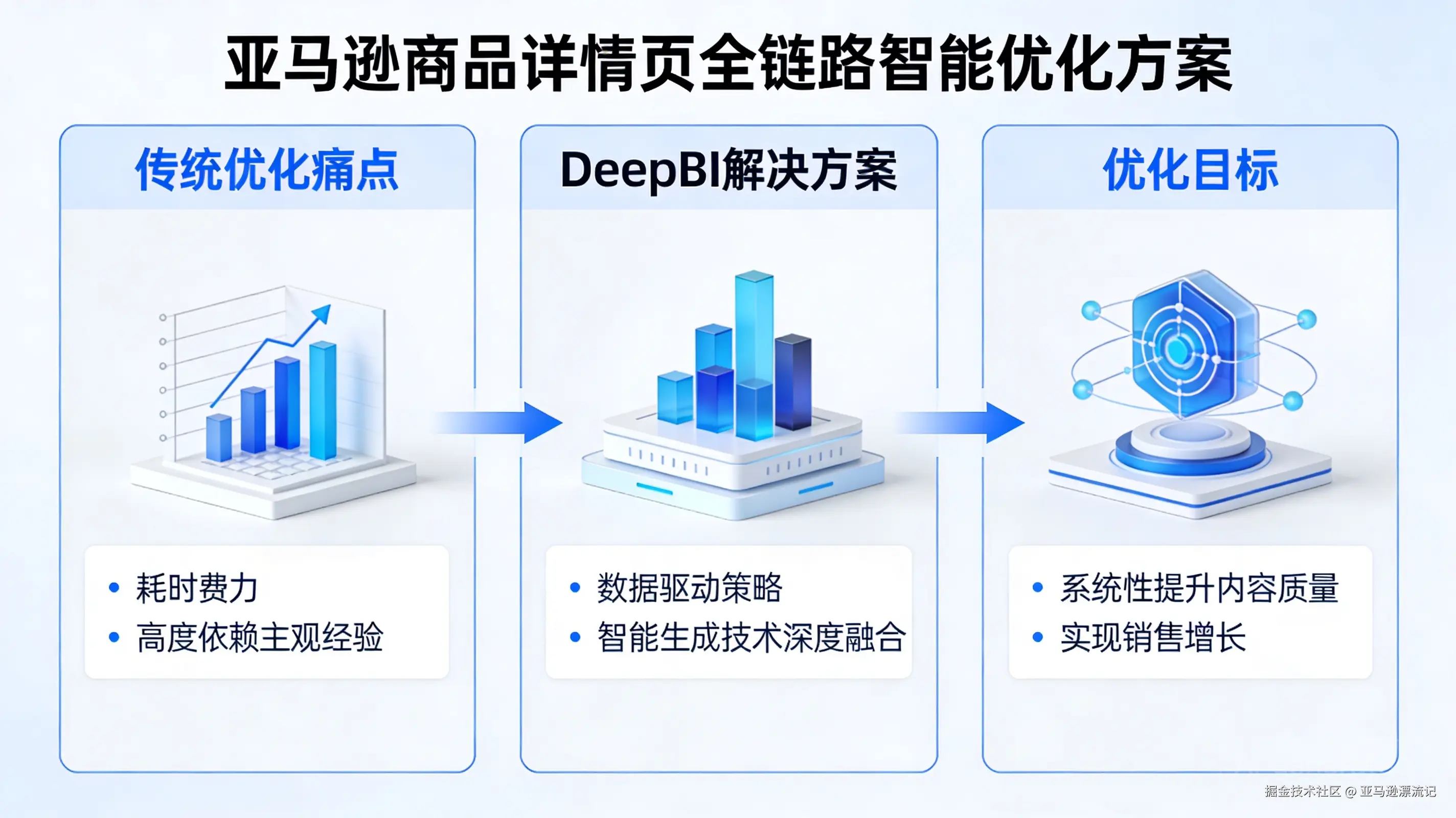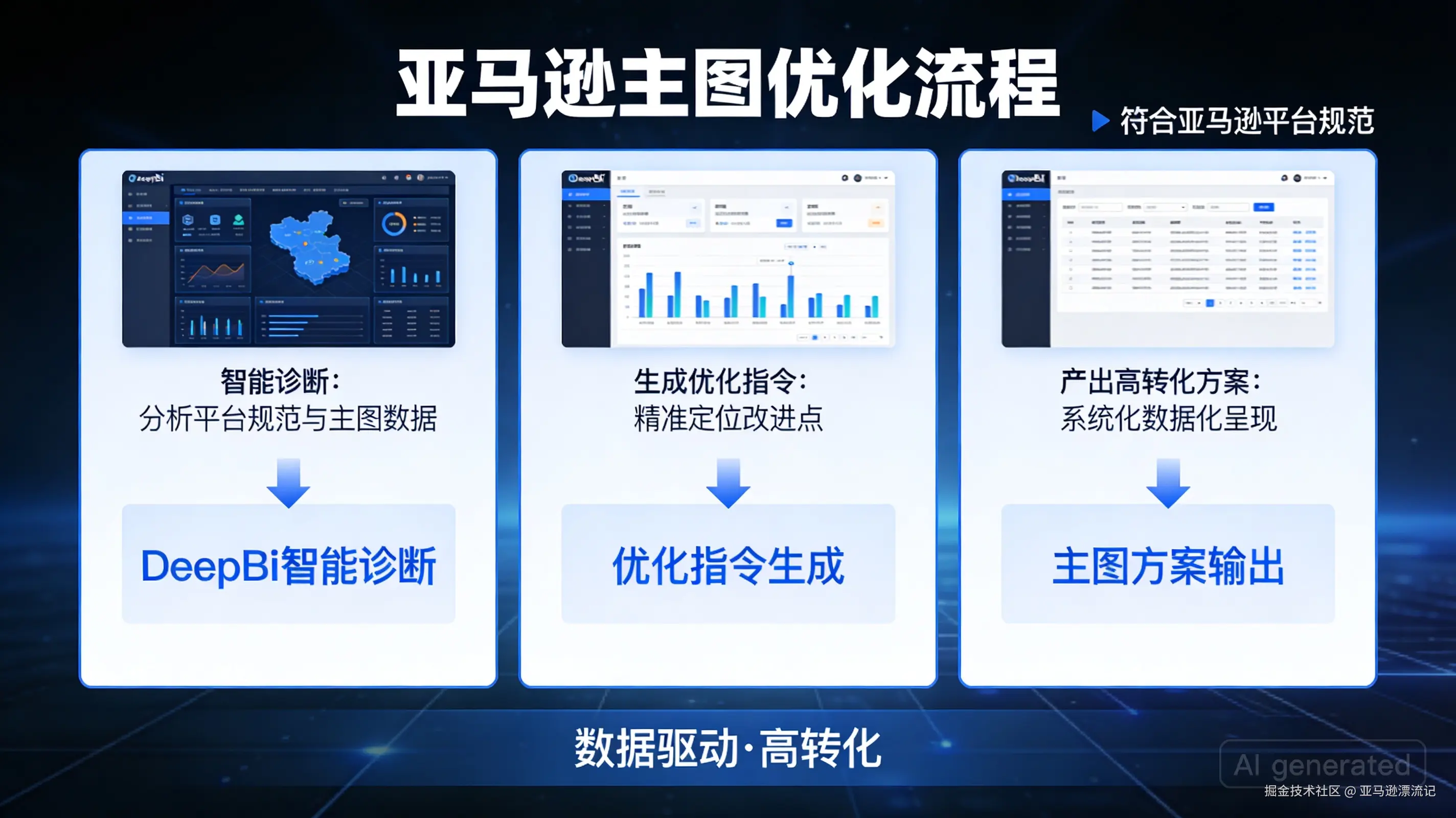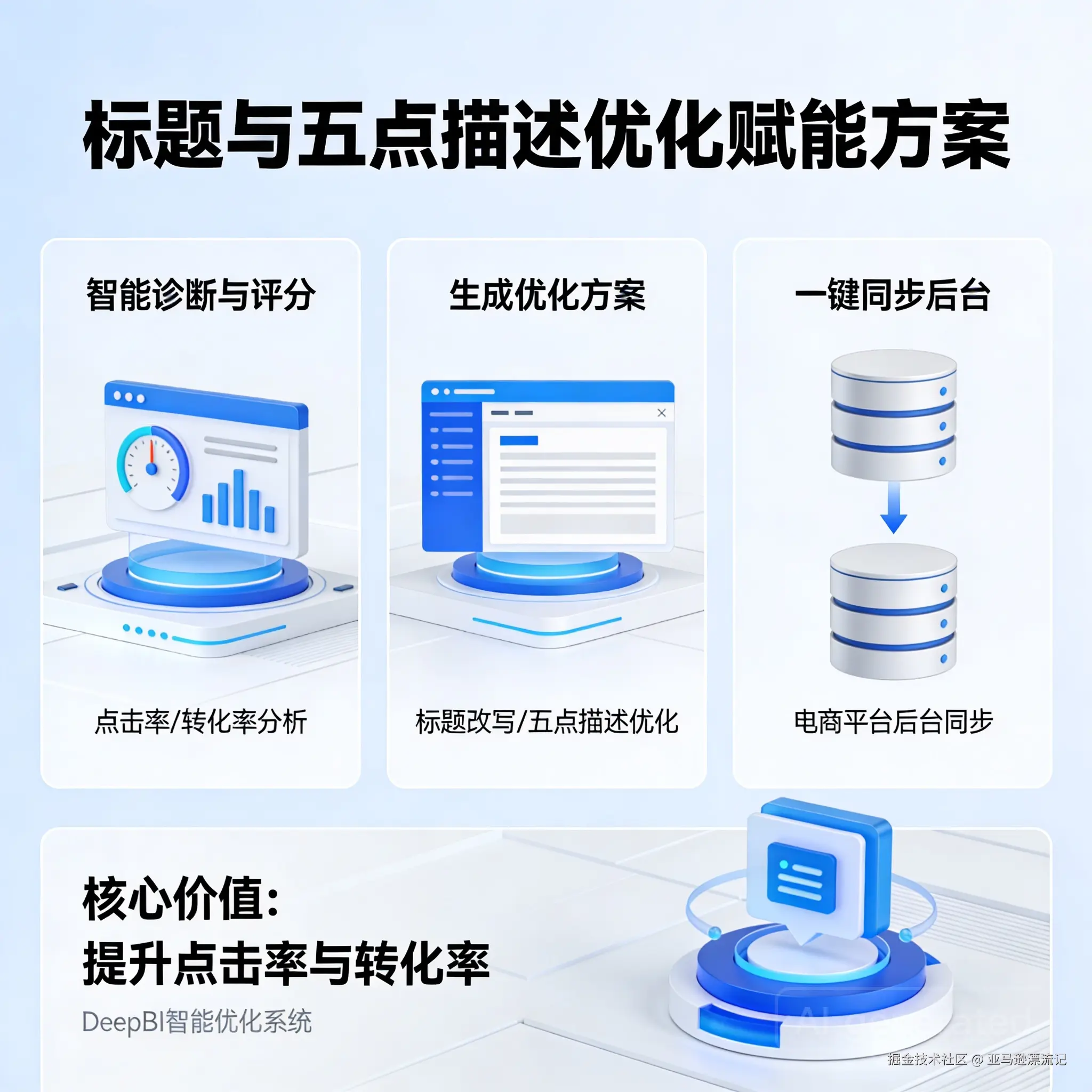 然而,传统的优化过程高度依赖运营人员的主观经验和审美判断,不仅耗时费力,其效果也难以量化和复制。为解决这一痛点,DeepBI 提供了一套全链路智能优化解决方案。该方案将数据驱动的策略与 AI 生成技术深度融合,旨在帮助卖家系统性地诊断、优化并创造出更具市场竞争力的 Listing 内容,最终实现稳定且高效的销售增长。