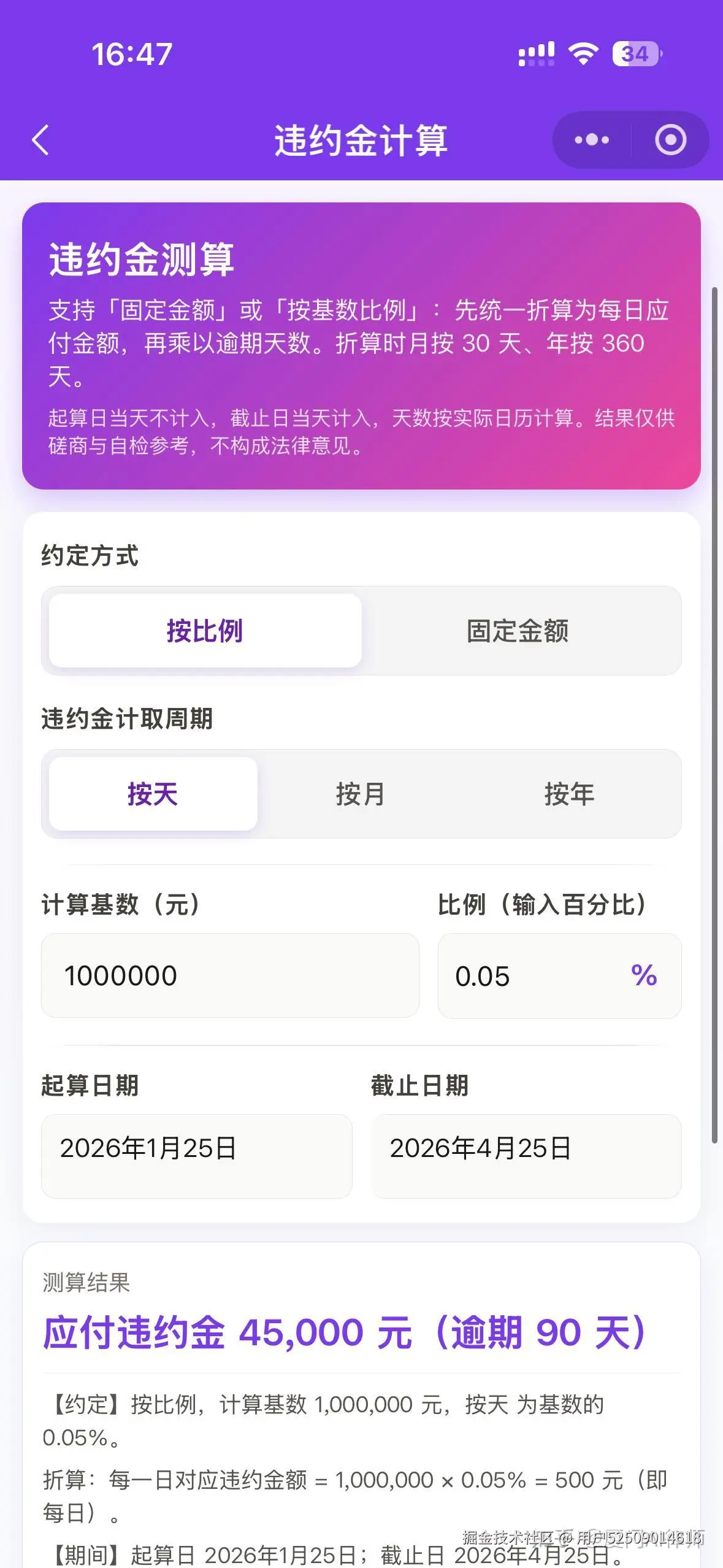- 功能五——违约金计算:根据约定的违约金比例或金额,计算出违约期间的总违约金金额,违约金可按天计、按月计,也可按年计。