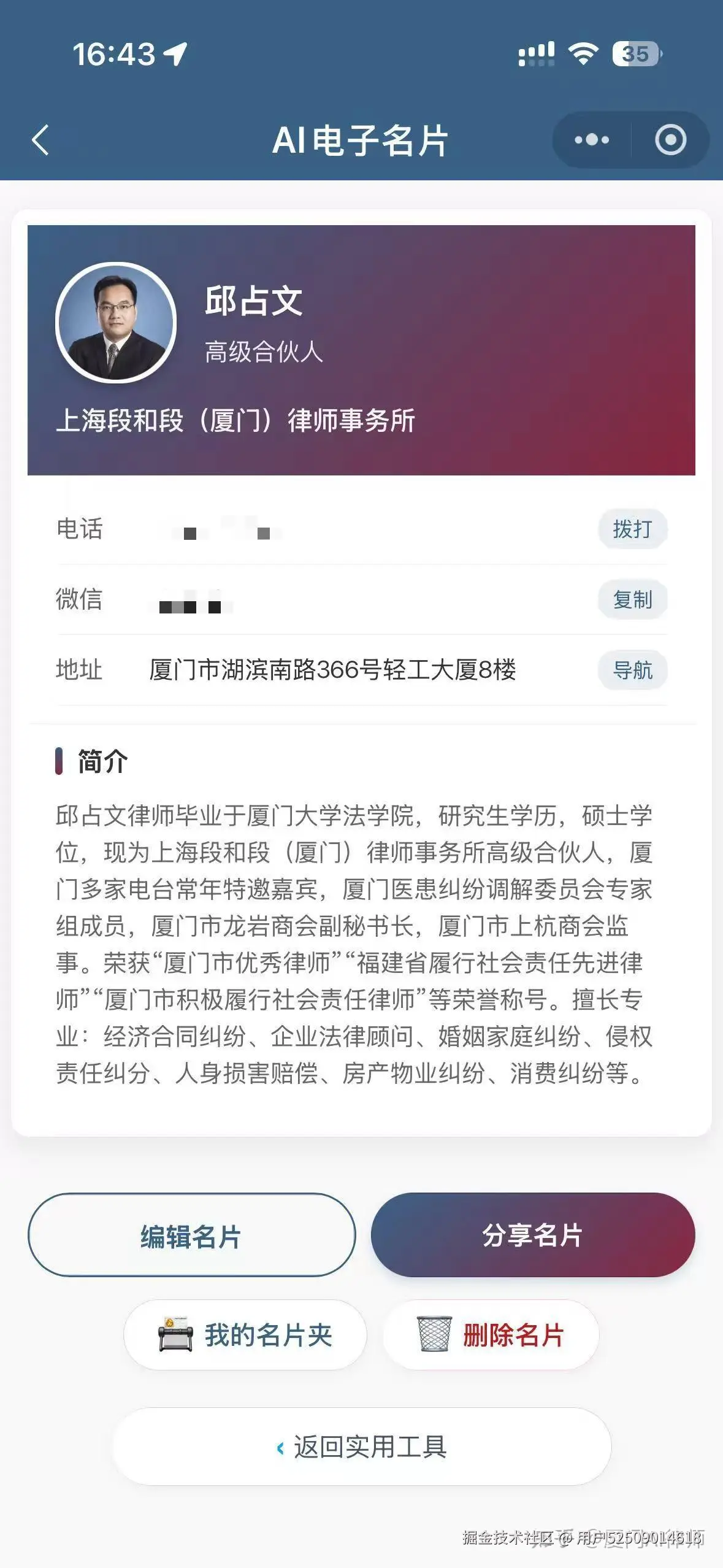 - 功能一——定制电子名片:专门为律师或公司法务人员定制的精美电子名片,不仅高端大气上档次,而且你可以随时修改名片上的信息,客人手中的电子名片会跟随着你的修改而修改,让你与客户之间始终保持联系。