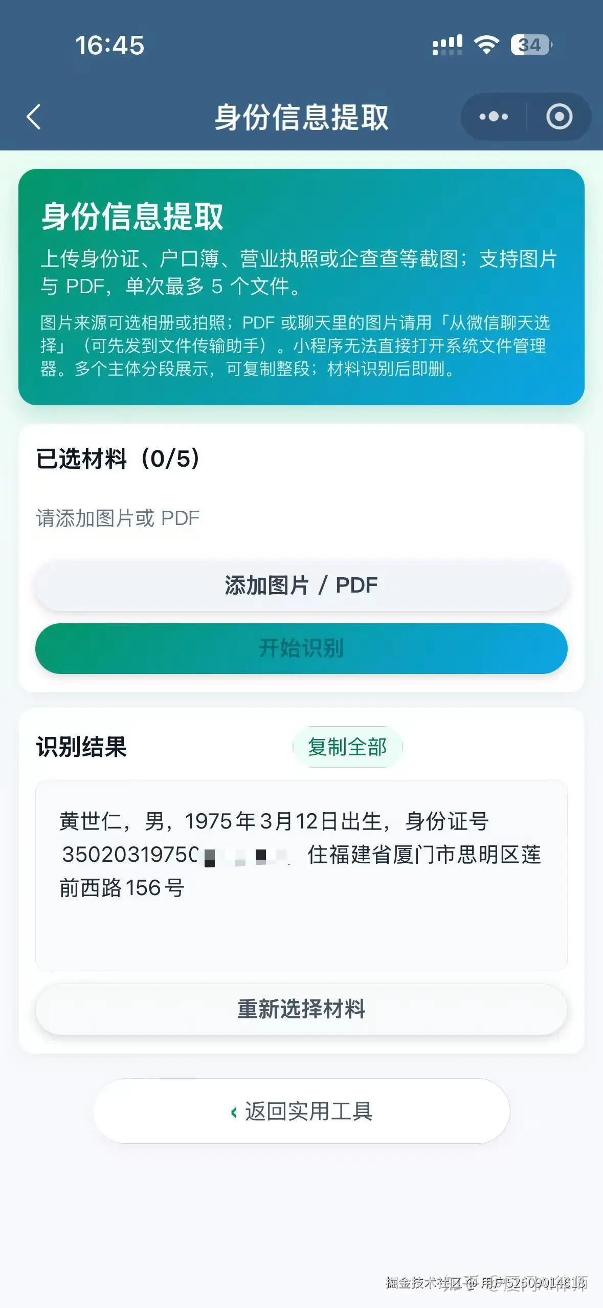 - 功能三——身份信息提取:上传当事人的身份证、户口簿、营业执照、企查查截图等,自动提取出起诉状或答辩状所需的身份信息,保证内容准确可靠,省时省事。