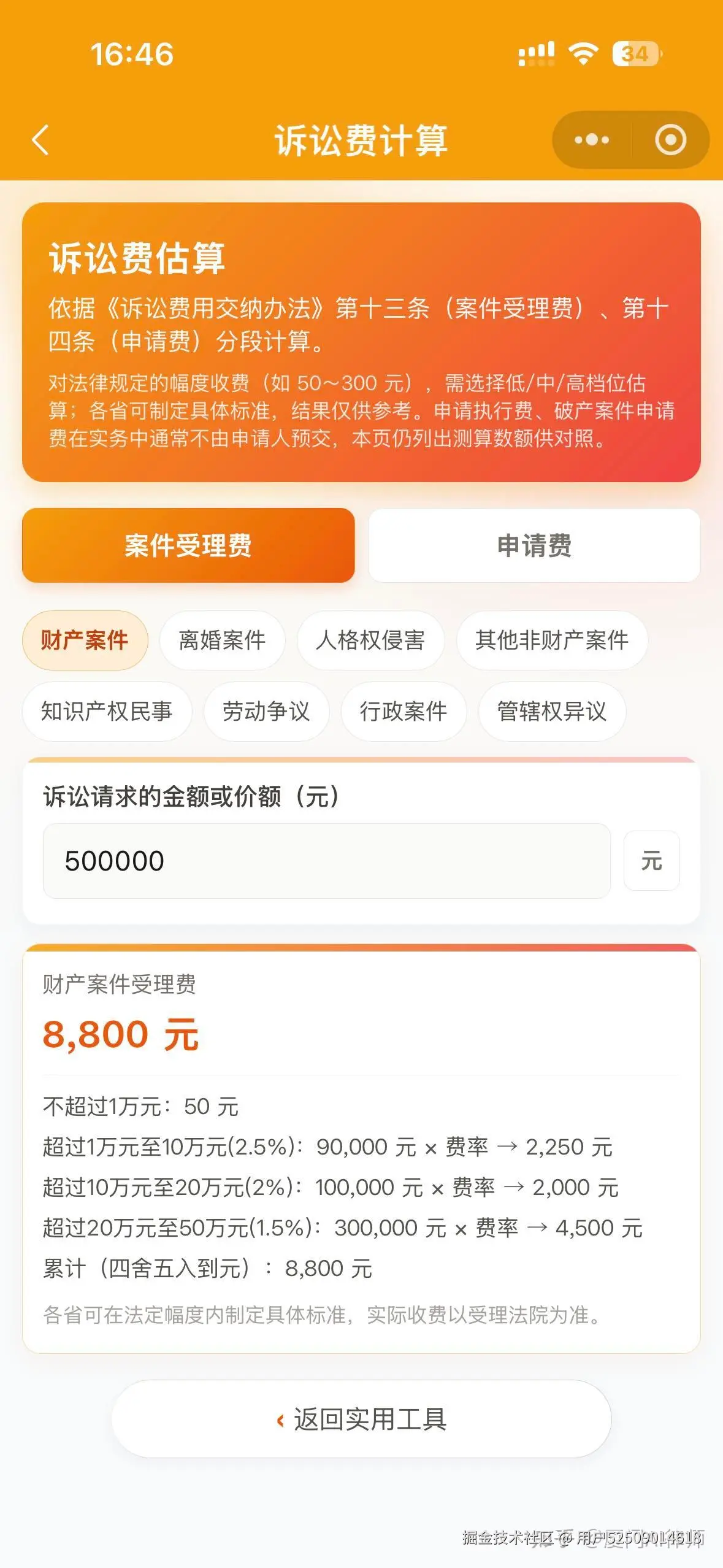 - 功能四——诉讼费计算:根据不同的案件类型智能计算出法院收取的案件受理费、申请费等诉讼费用。