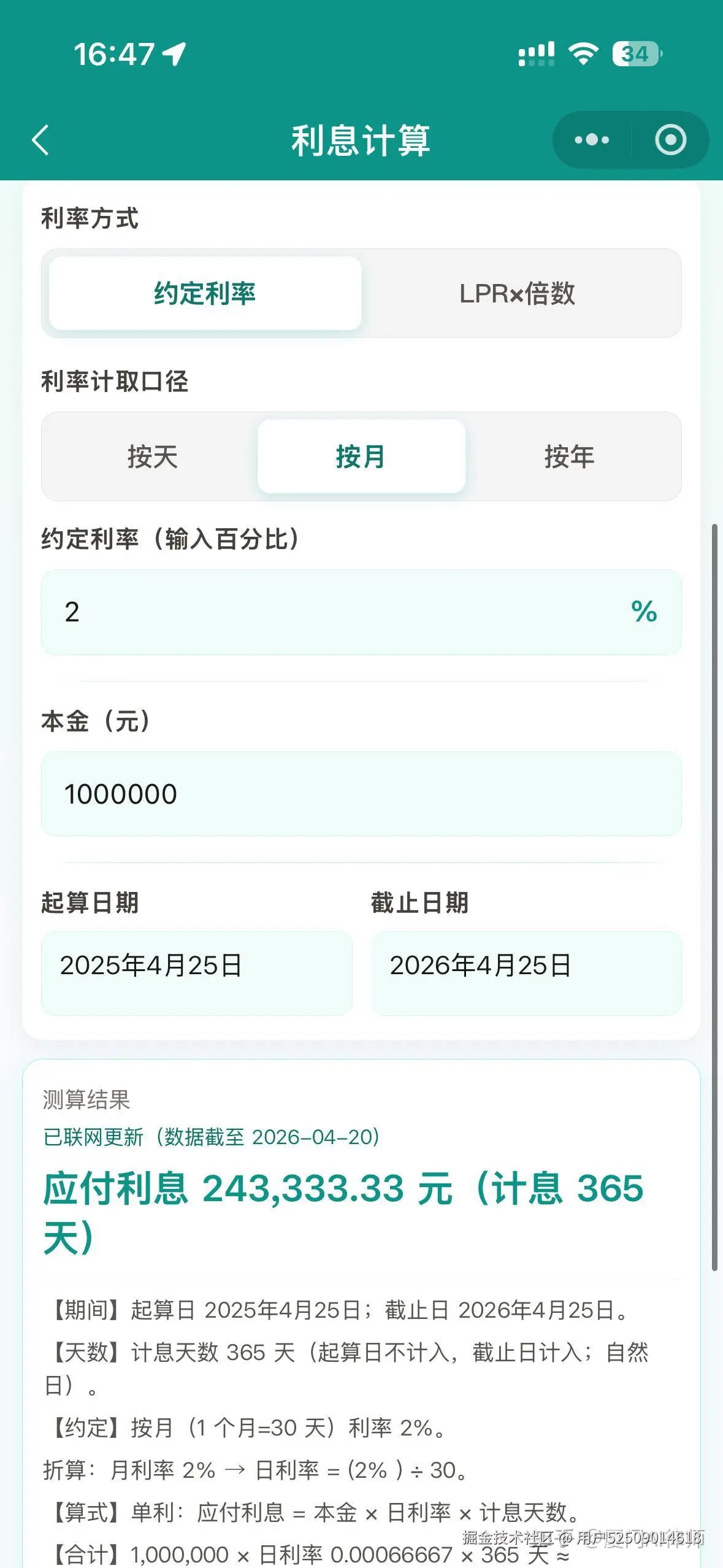 - 功能六——利息计算:根据约定的利率或者标准的LPR计算任意期间的利息;根据LPR计算利息时,当LPR发生调整,可自动分段计算,并给出明确的说明。