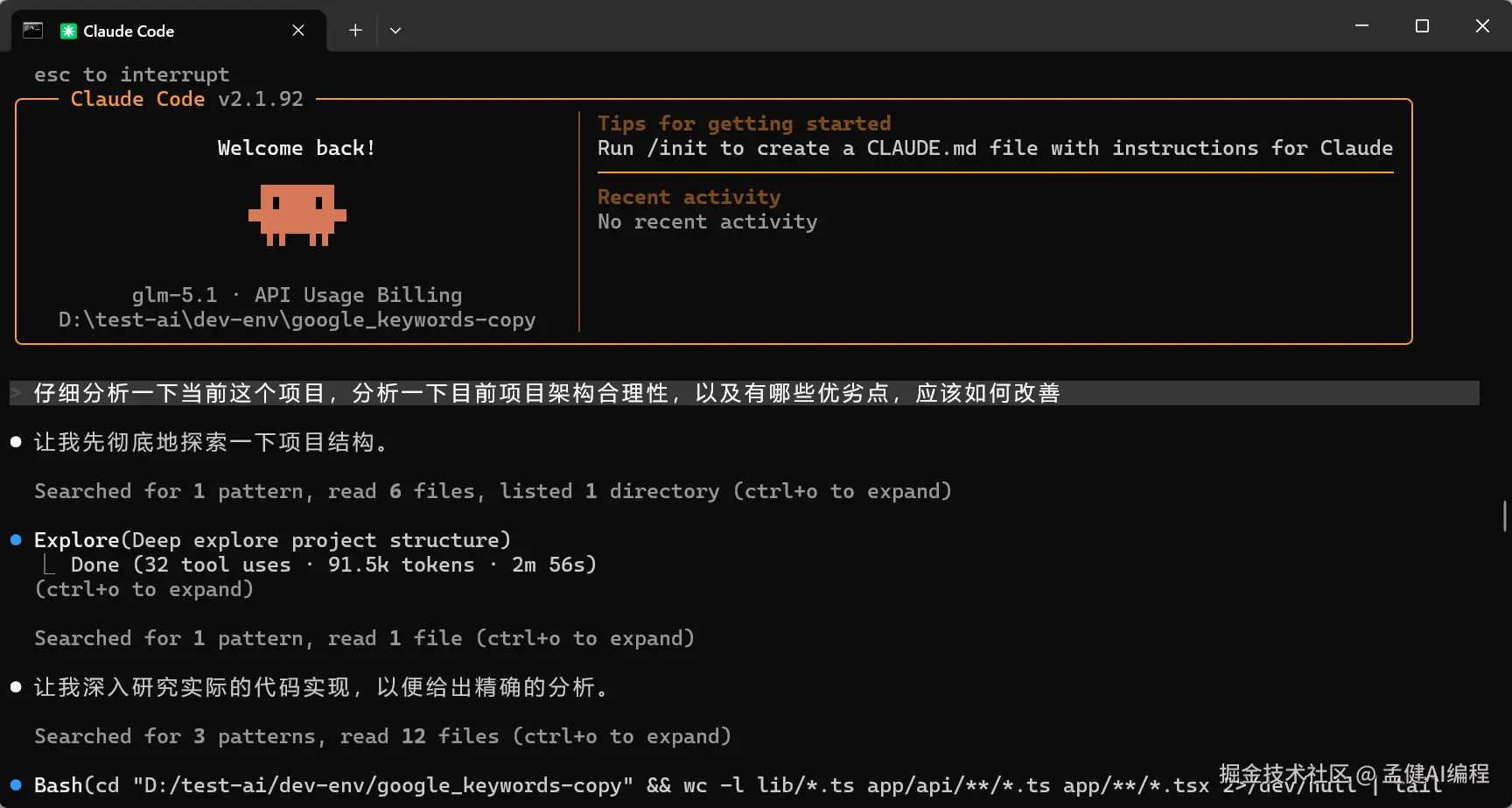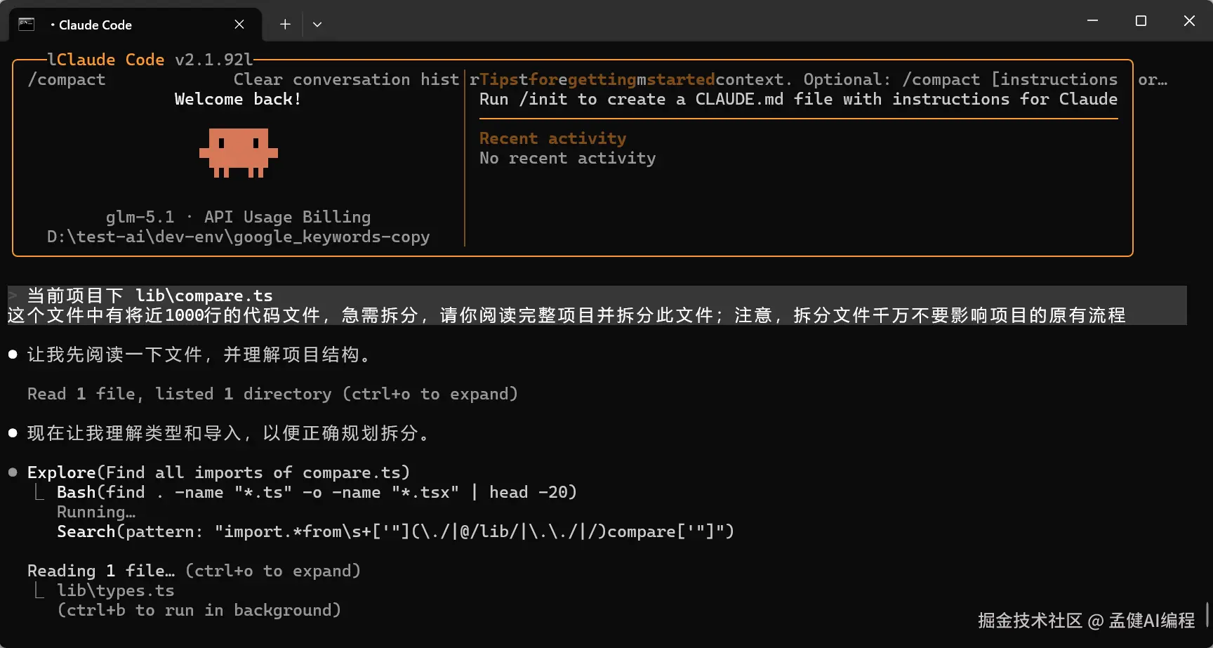 同样的项目,同样的文件,同样的提示词,我现在让 GLM-5.1 拆一下看看。