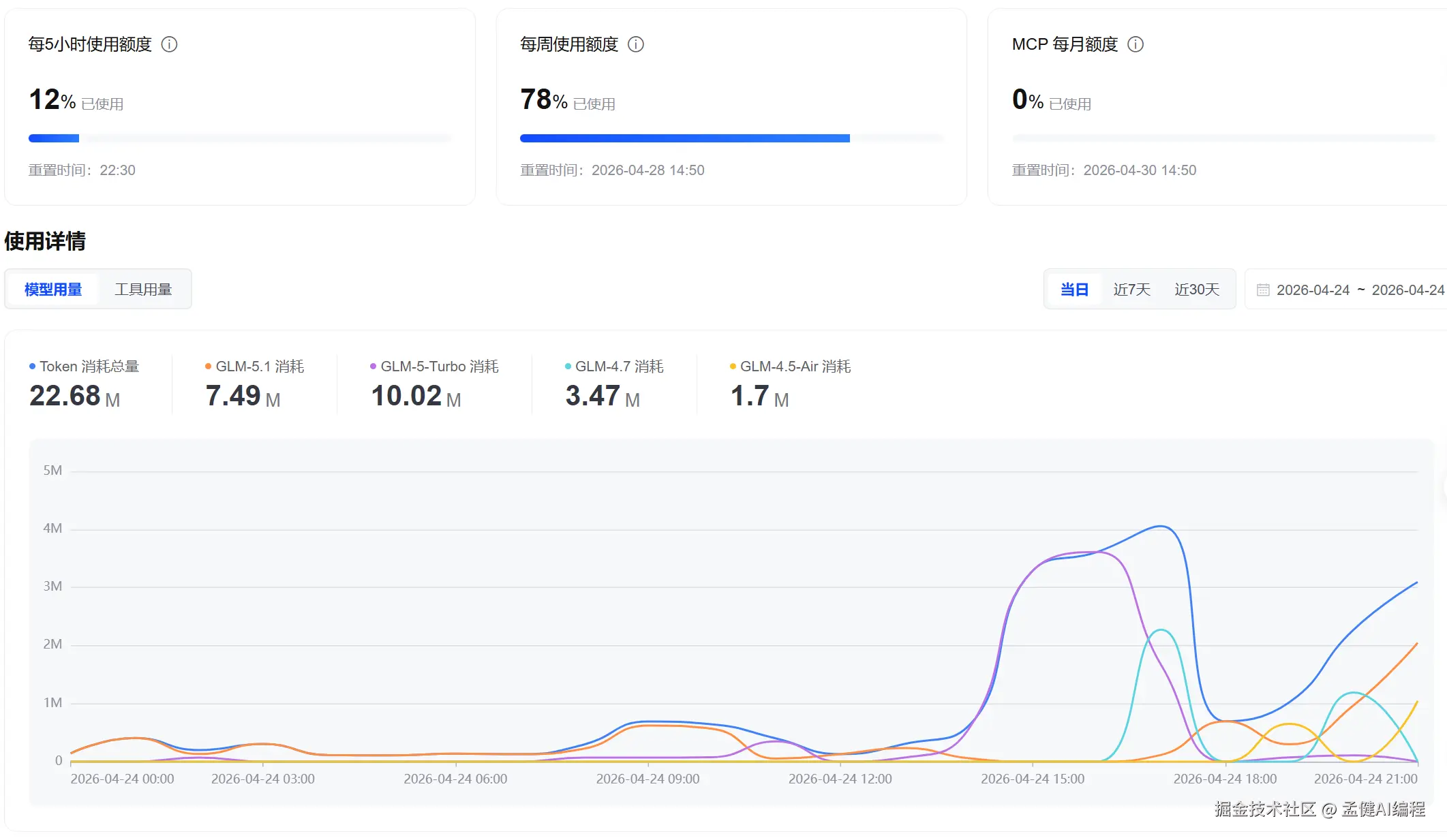 GLM-5.1 因为有 Coding Plan,但是消耗的量也不少;下图为今日消耗详情。