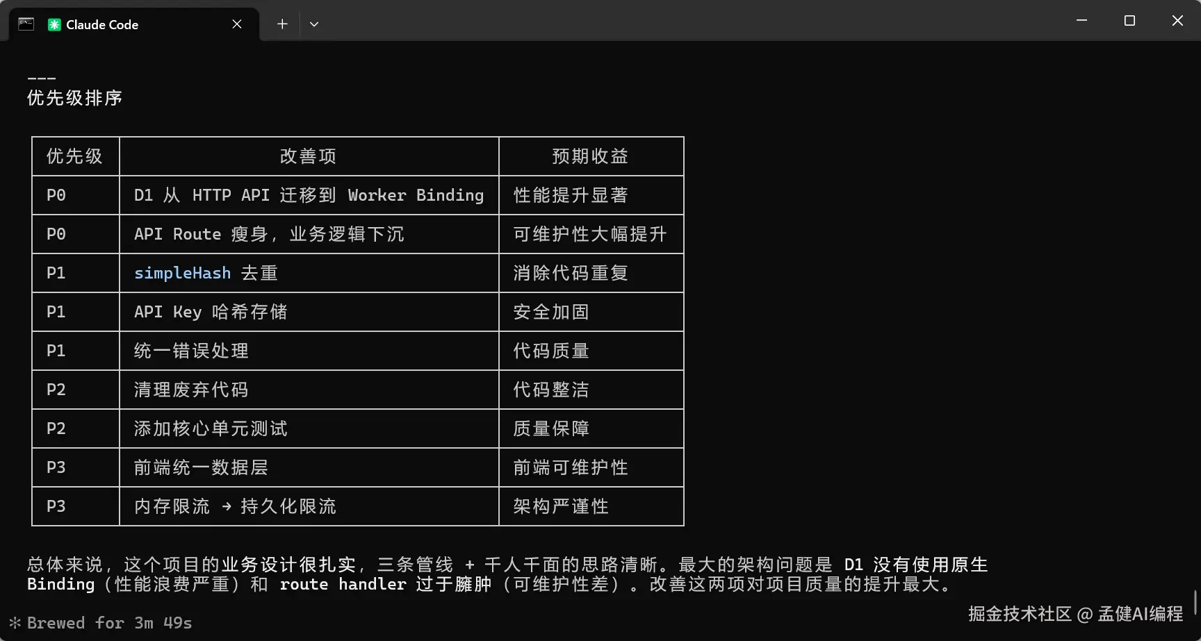 GLM-5.1 分析的也不错,当我让它开始分析项目的时候,它首先彻底全面的探索了我的整个项目目录,之后才进行分析,对于整体的项目架构分析的比较扎实;最后更是通过优先级排序的方式给出了项目的优化计划,最后还明确指出了项目没有使用D1原生绑定功能,给的建议更加实用,因此感觉GLM-5.1对于整体项目的把握度优 DeepSeek-V4-Pro。