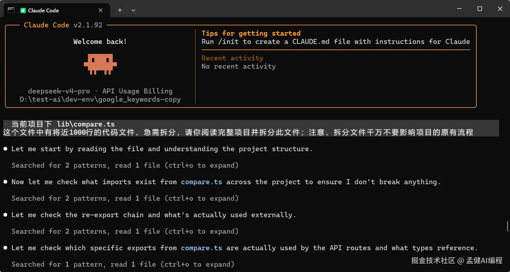 在速度上,GLM-5.1 稍稍领先,DeepSeek 拆分的更为精细,将 compare 拆分为 通用工具、判断、新鲜度以及意图识别4个文件,拆分的更加精细,在代码文件拆分的精细程度上,似乎 DeepSeek-V4-Pro 略胜一筹。