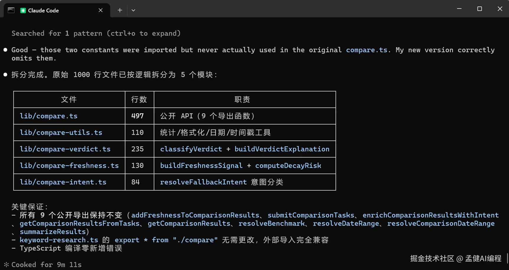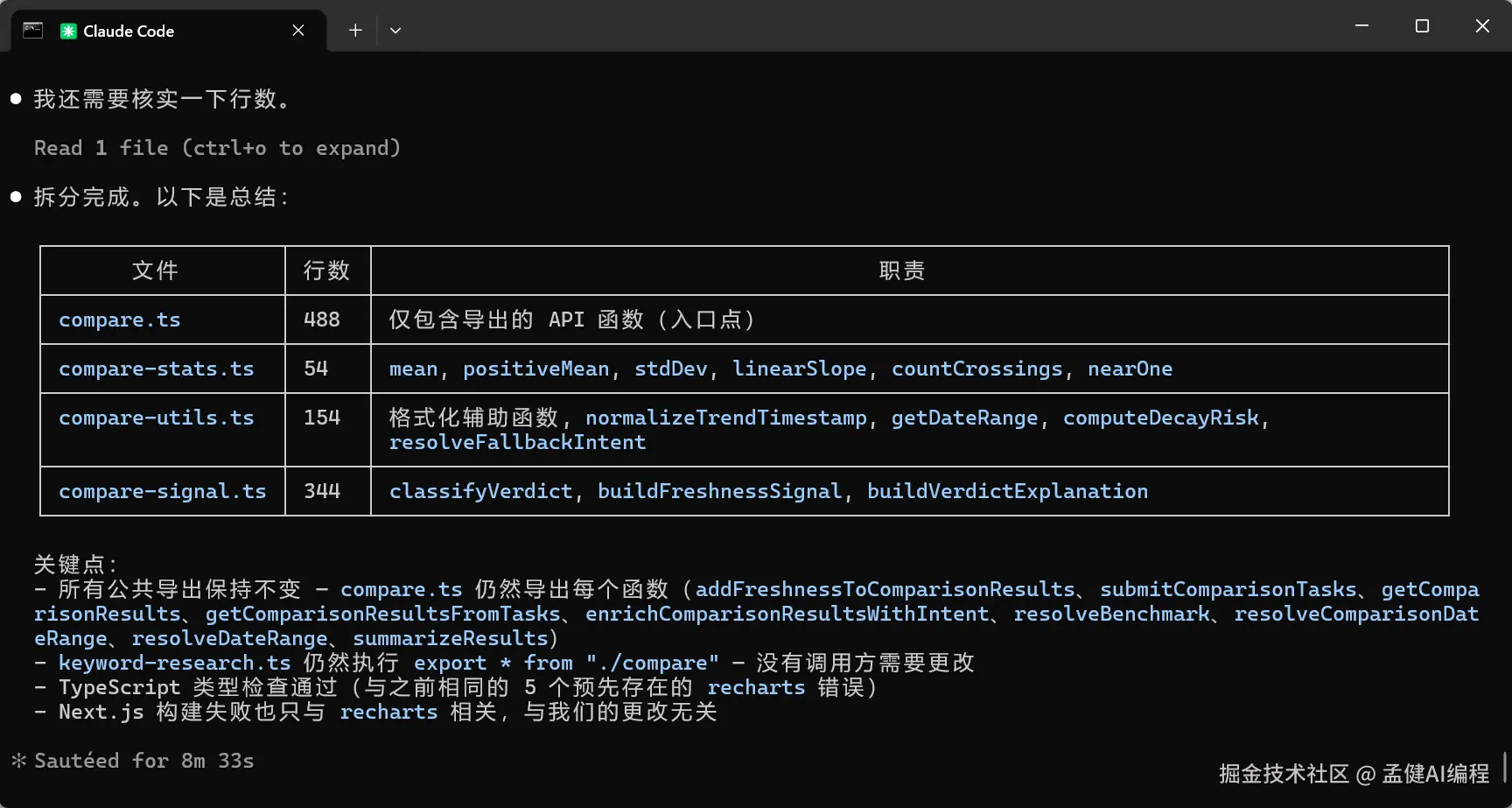 现在 GLM-5.1 与 DeepSeek-V4-Pro 都已经对这个超过1000行的代码文件做完了拆分;GLM-5.1 将这个文件拆分为了4个文件,用时大概8分33秒;DeepSeek-V4-Pro 将这个文件拆分为5个文件,用时大概9分11秒。