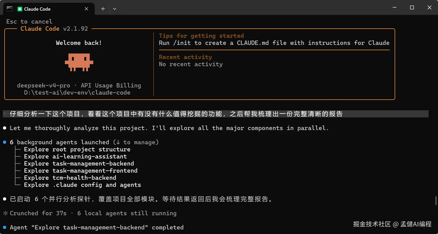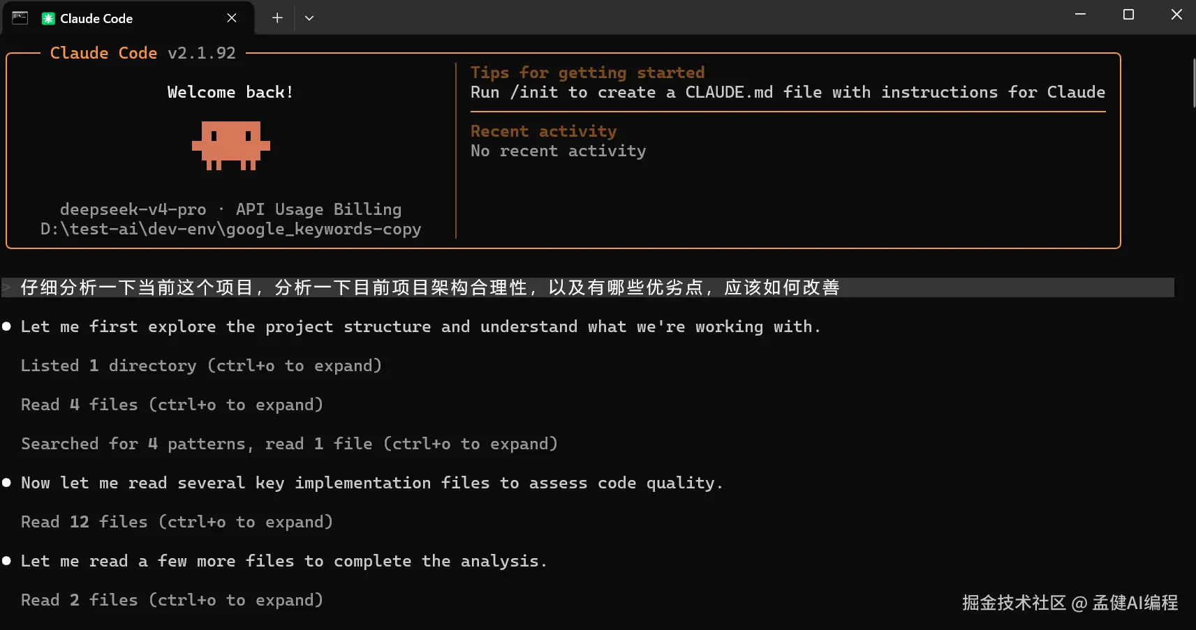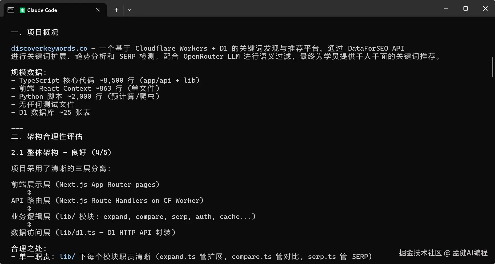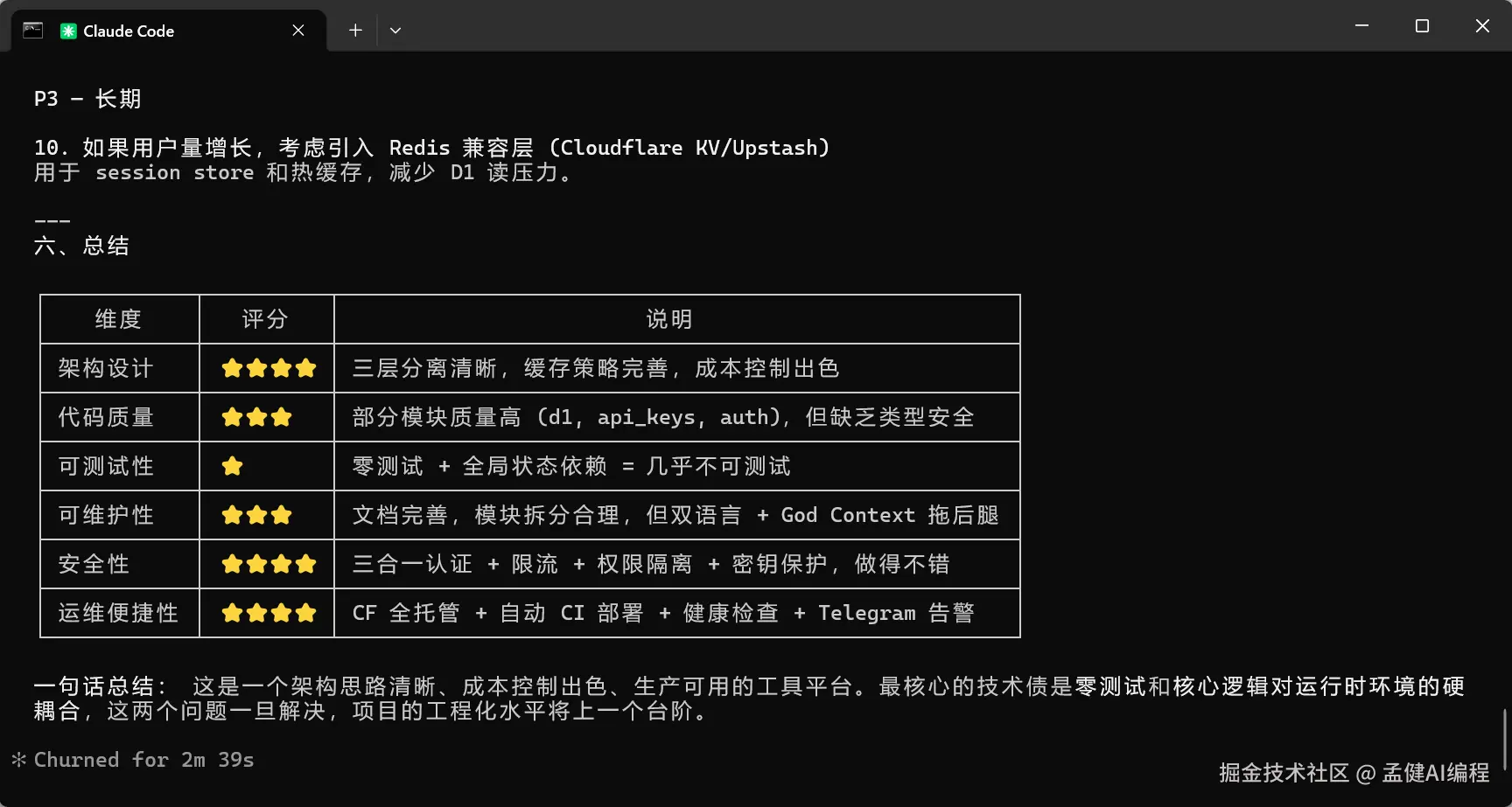 可以看到,现在 DeepSeek-V4-Pro 以及 GLM-5.1 都对我的项目进行了分析并给出完整的分析报告,通过上面的项目架构分析可以看出,DeepSeek-V4-Pro 给出的架构分析比较全面,特别是最后的总结通过表格给出,还从不同的维度给出了评分,最后的一句话总结把项目的优劣都给说到了。