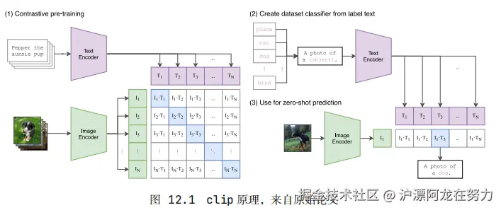 CLIP的训练叫对比学习:在一个批次里,有N张图和N句话,每张图只对应其中一句话。CLIP要在这个N×N的相似度矩阵中,把对角线上的N个配对分数拉高,把其他所有的配对分数压低。